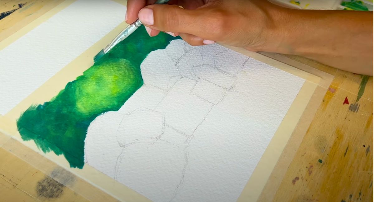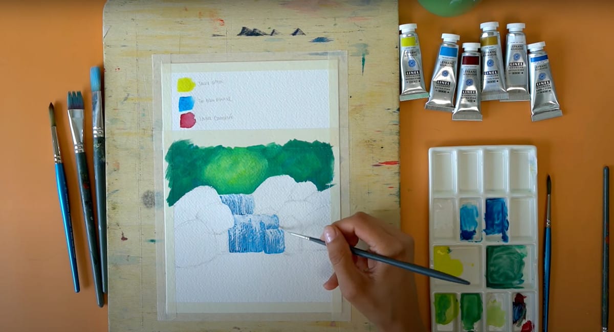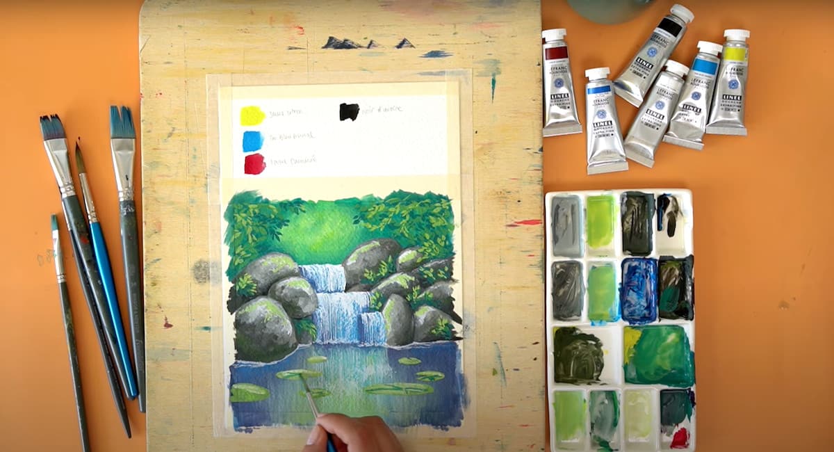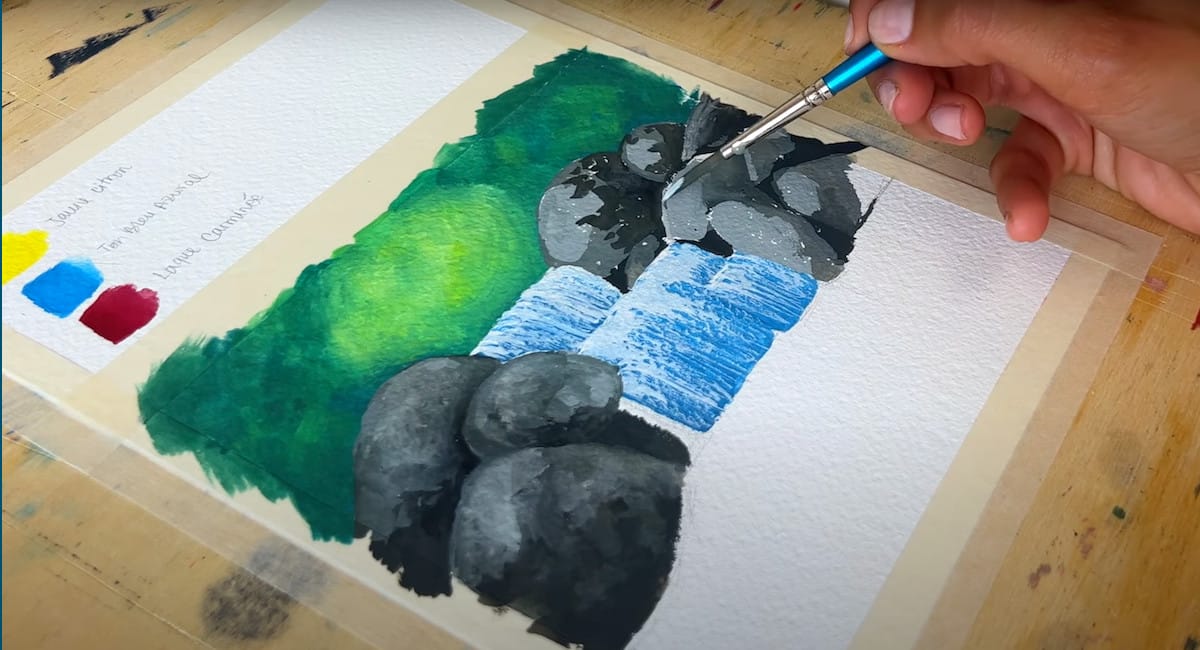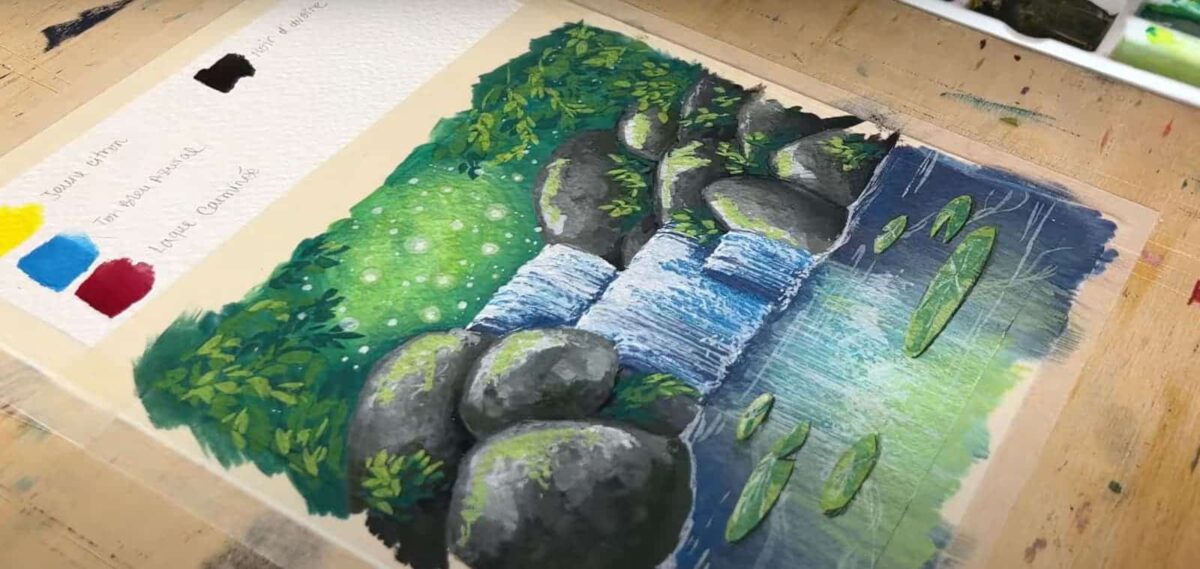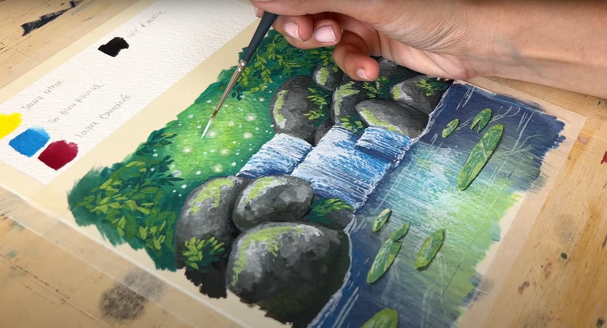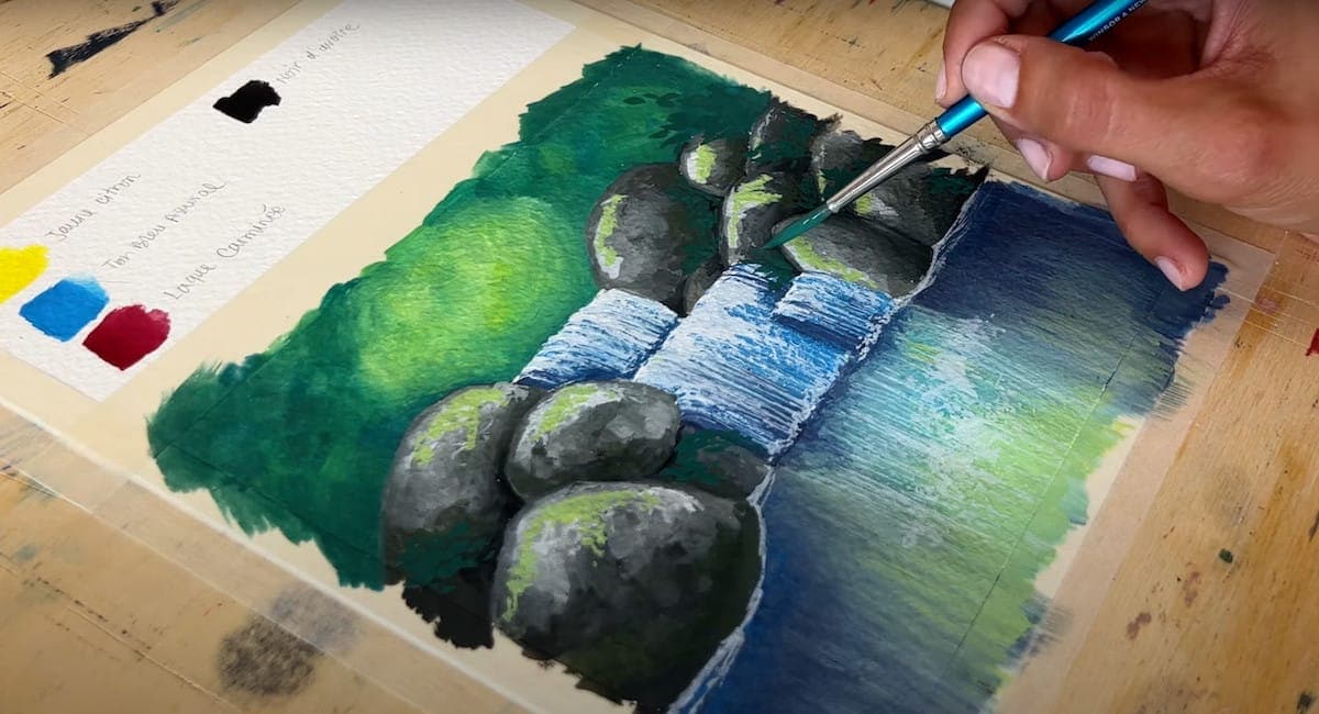 Se vuoi che i colori si mescolino con più controllo, puoi aspettare che lo strato sotto asciughi completamente e poi passare al successivo. Nel video puoi vedere bene come Giulia realizza le gocce d’acqua e la vegetazione sui sassi con dei colori molto chiari.