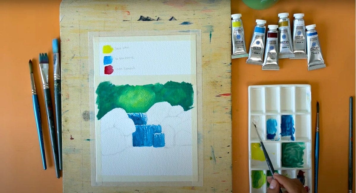 Iniziamo mescolando Giallo Limone e il Tono Blu Azzurro per ottenere un verde molto chiaro e saturato. Nella tavolozza mettiamo anche il bianco per rendere i toni ancora più luminosi. In questa illustrazione giochiamo molto sul contrasto quindi, nei punti più vicini alle rocce, usiamo un tono più scuro.