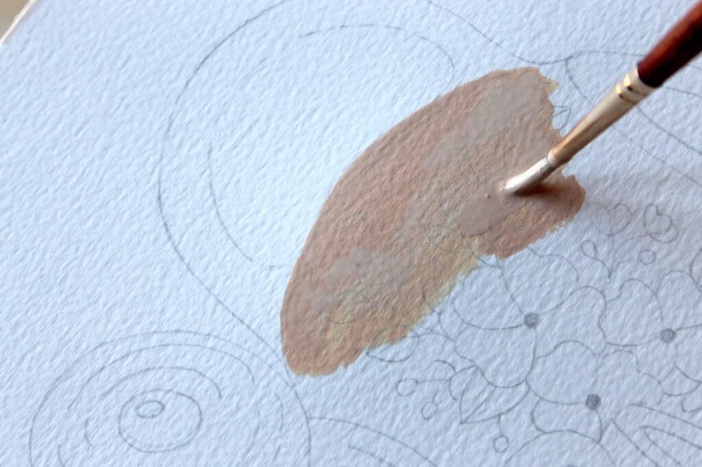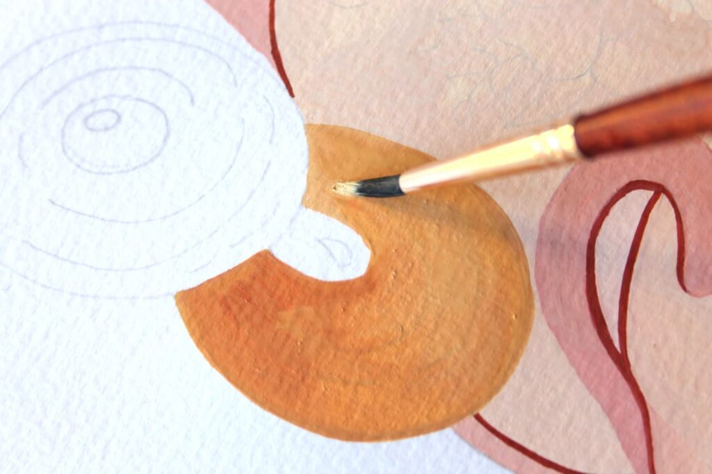 Una volta asciugata la base dei fiori, ricaviamo un tono di marrone scuro mescolando su una tavolozza l’Ocra Rossa e una punta di Nero.
