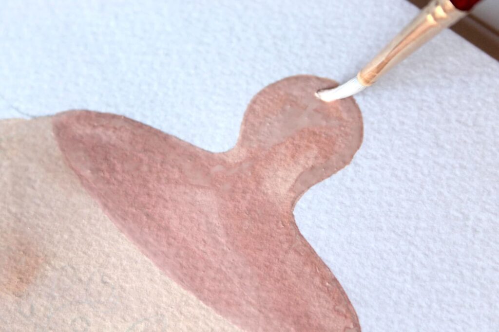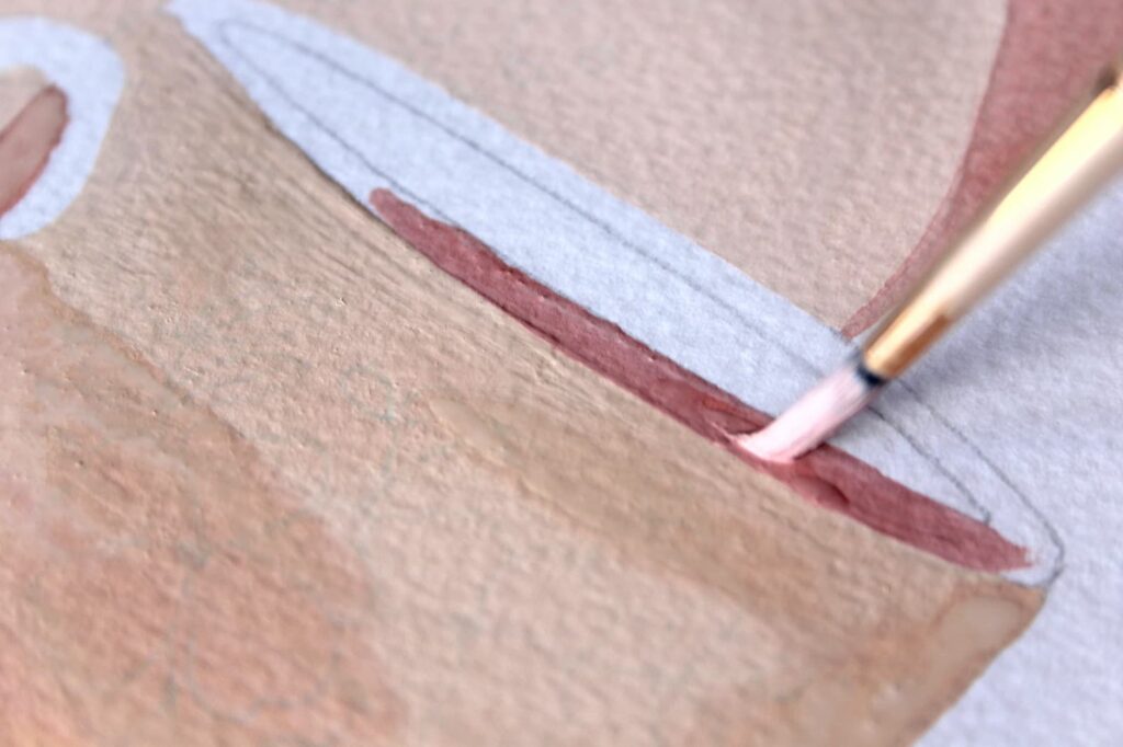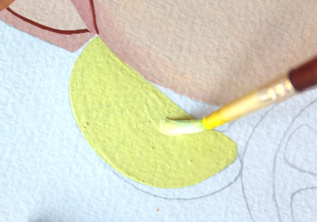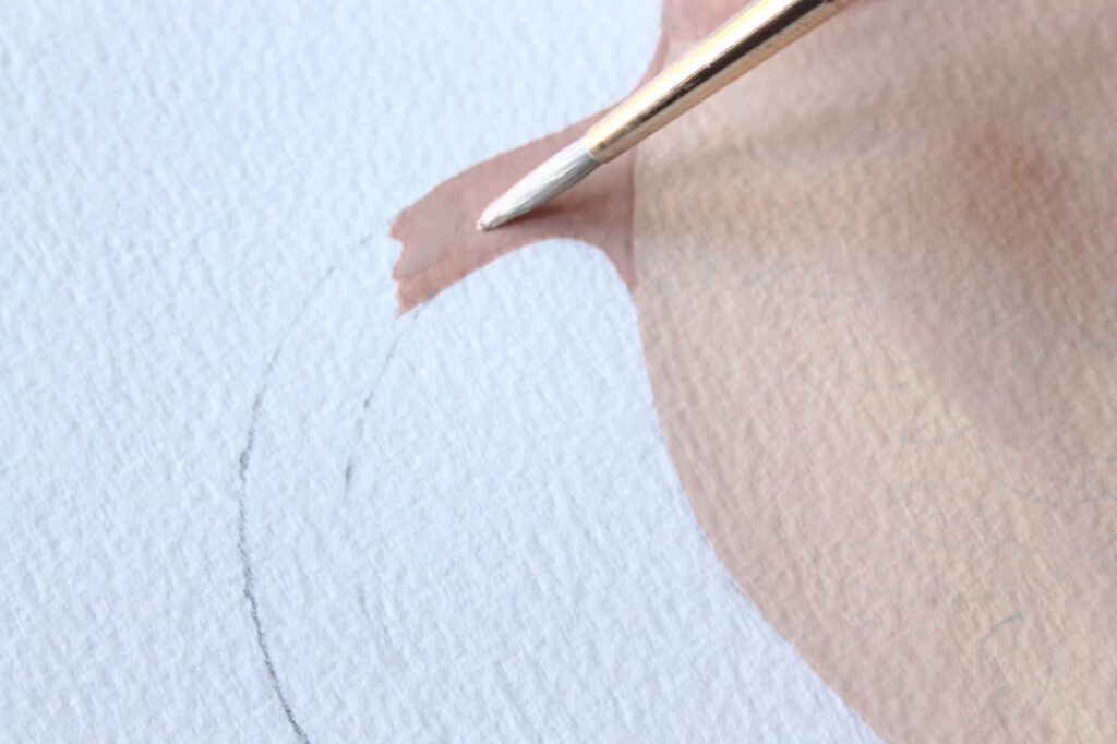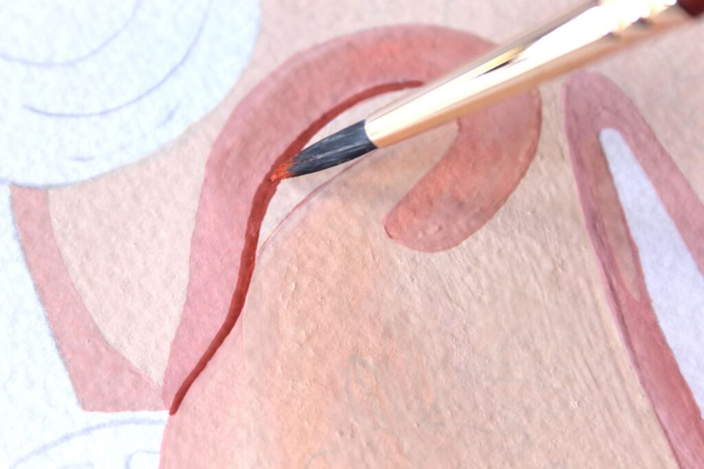 Adesso con il rosa ottenuto dipingete seguendo i bordi del disegno a matita. Stendete il colore con pennellate corpose ed evitate di ripassare con il pennello sul colore già in fase di asciugatura.