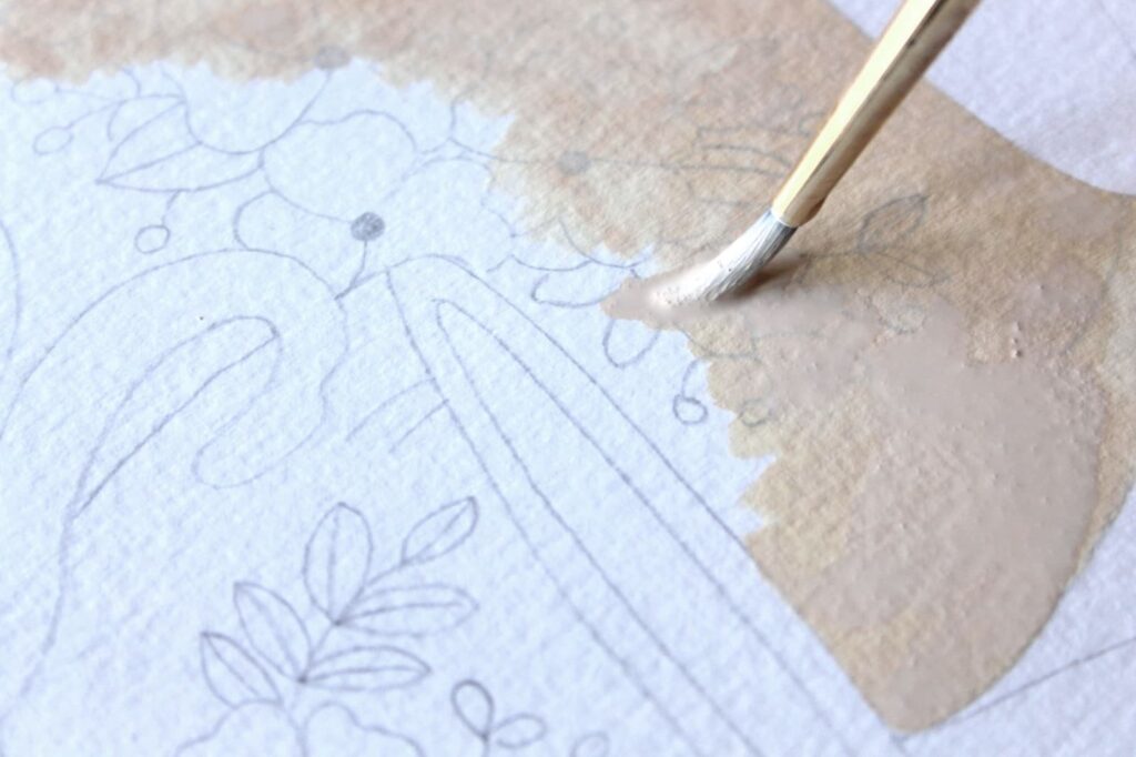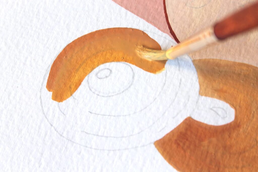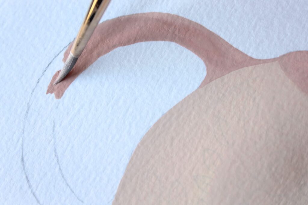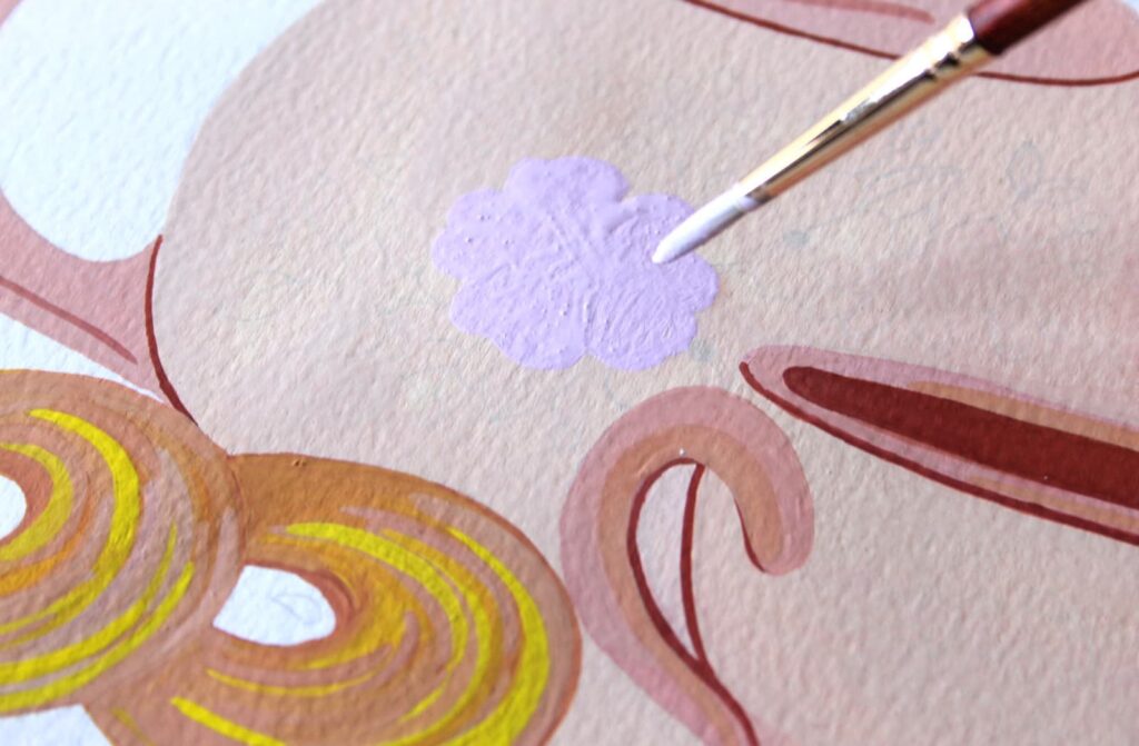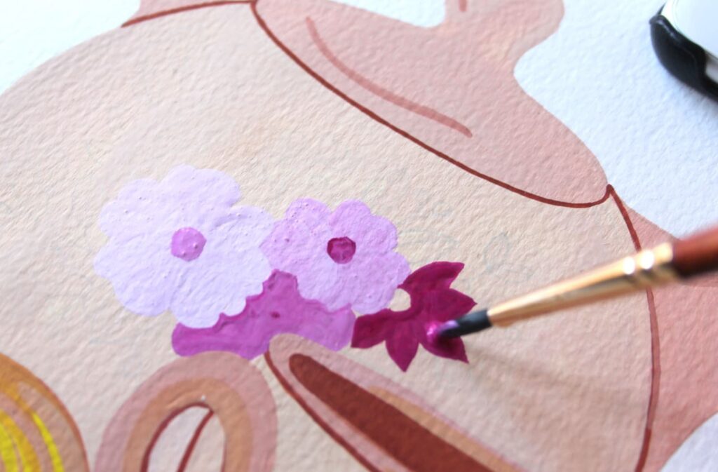 Adesso con il rosa ottenuto dipingete seguendo i bordi del disegno a matita. Stendete il colore con pennellate corpose ed evitate di ripassare con il pennello sul colore già in fase di asciugatura.