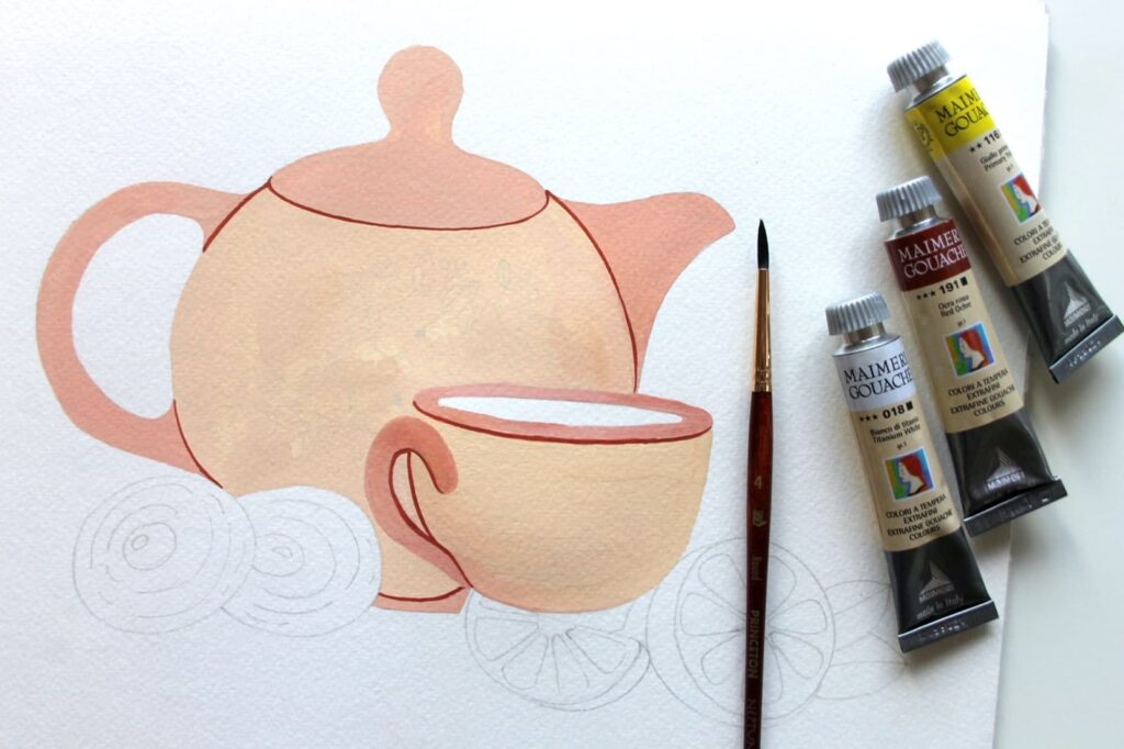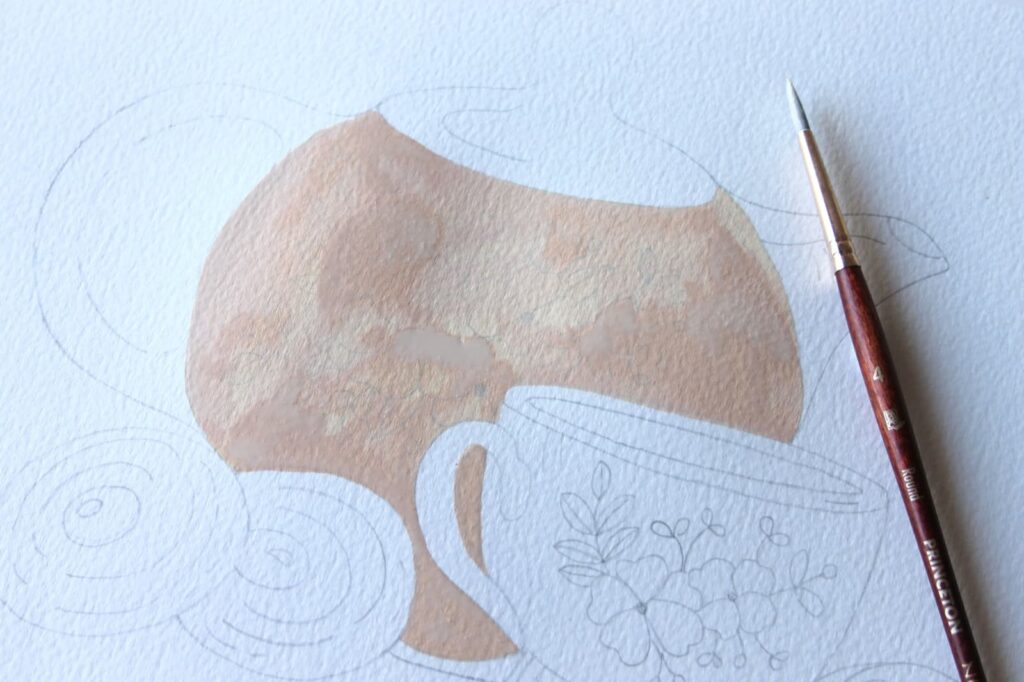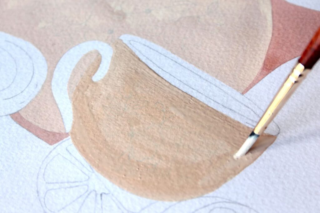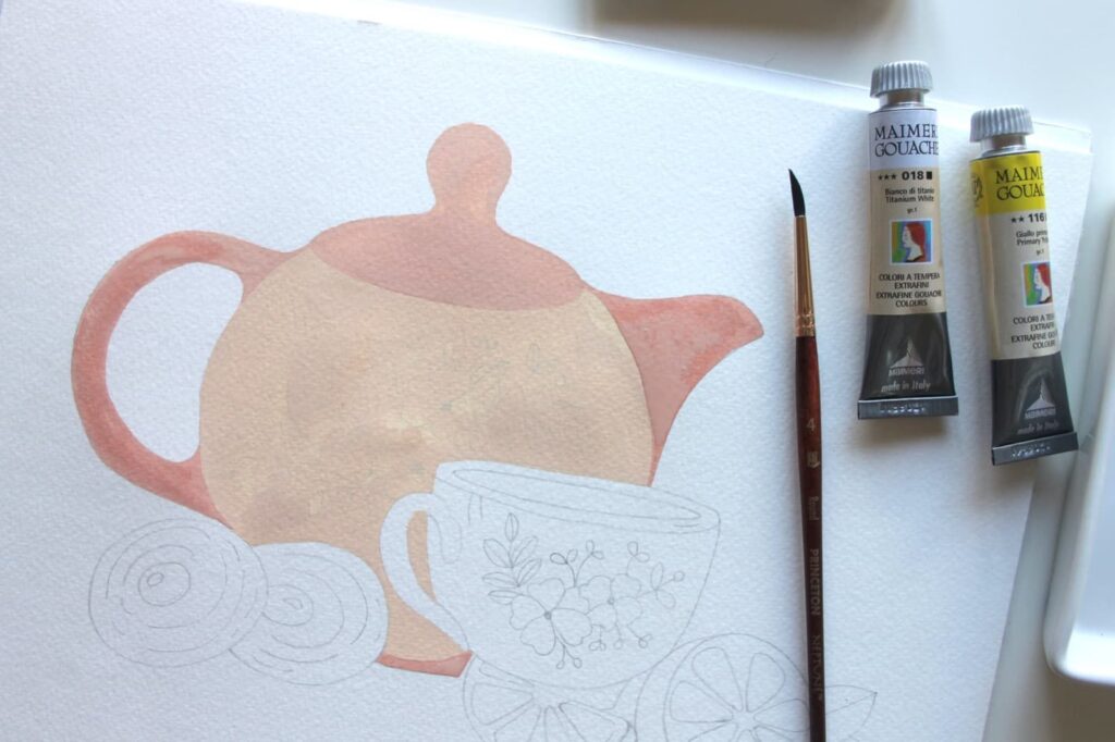 Con il pennello n° 4 tondo Princeton Neptune iniziate a stendere la prima base di colore della teiera, tralasciando i manici e il coperchio. In questa prima fase stendete il colore sul foglio in modo uniforme seguendo lo stesso verso.