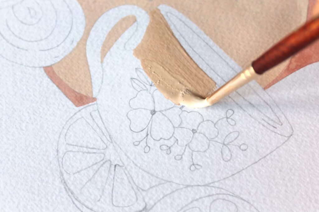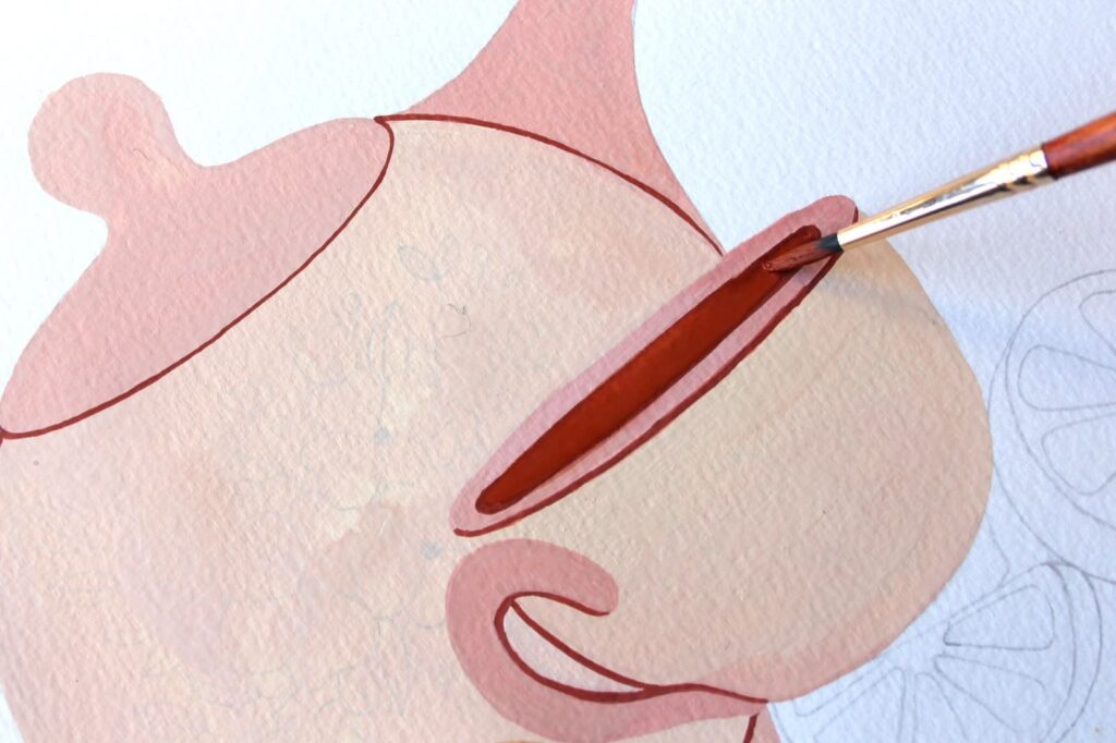 Una volta asciugato il colore, grazie alla fantastica punta del pennello n° 4 tondo Princenton Neptune potete definire i bordi della tazza e della teiera con l’Ocra Rossa.