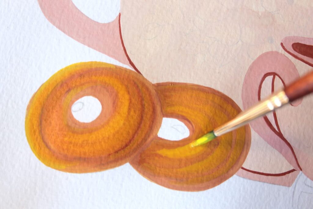 Una volta asciugata la base, con il Giallo Primario, diluito con un goccio d’acqua, dipingete delle leggere velature seguendo l’andatura circolare dei biscotti, formando degli anelli concentrici.