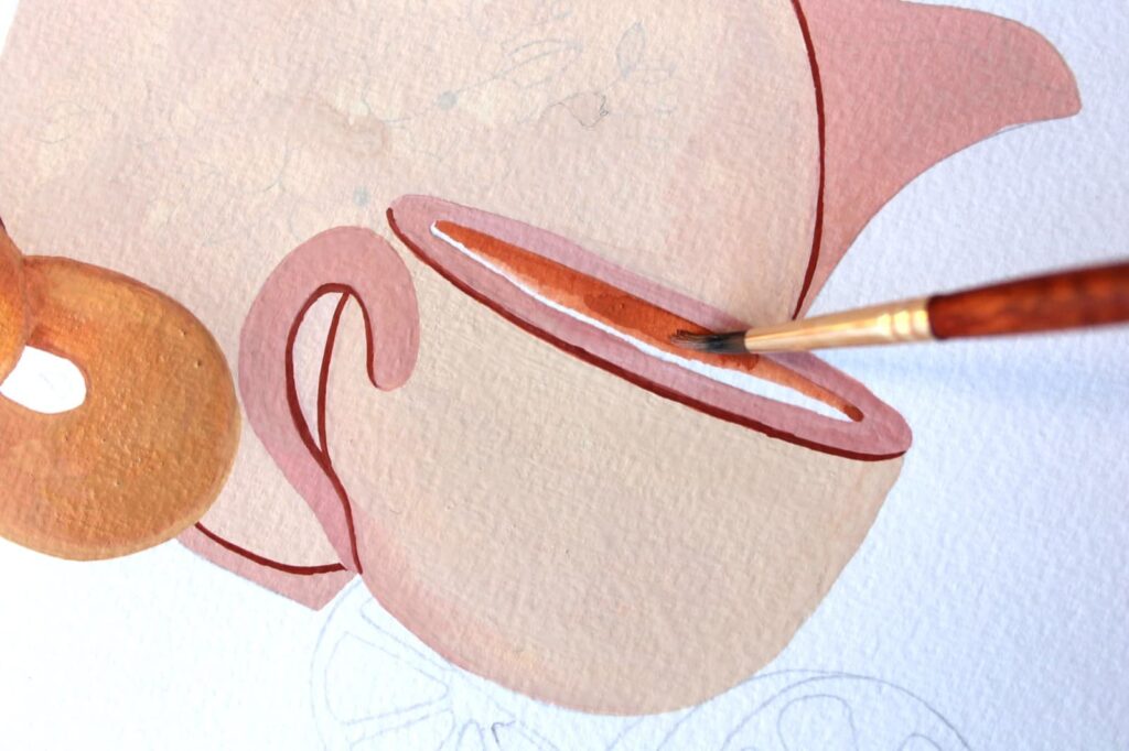 Bene, a questo punto procediamo con l’Ocra Rossa, diluite il colore con un goccio d’acqua e dipingete il contenuto della tazza, ovvero il nostro the, stendete il colore con il pennello prestando attenzione a non fuoriuscire dai bordi.