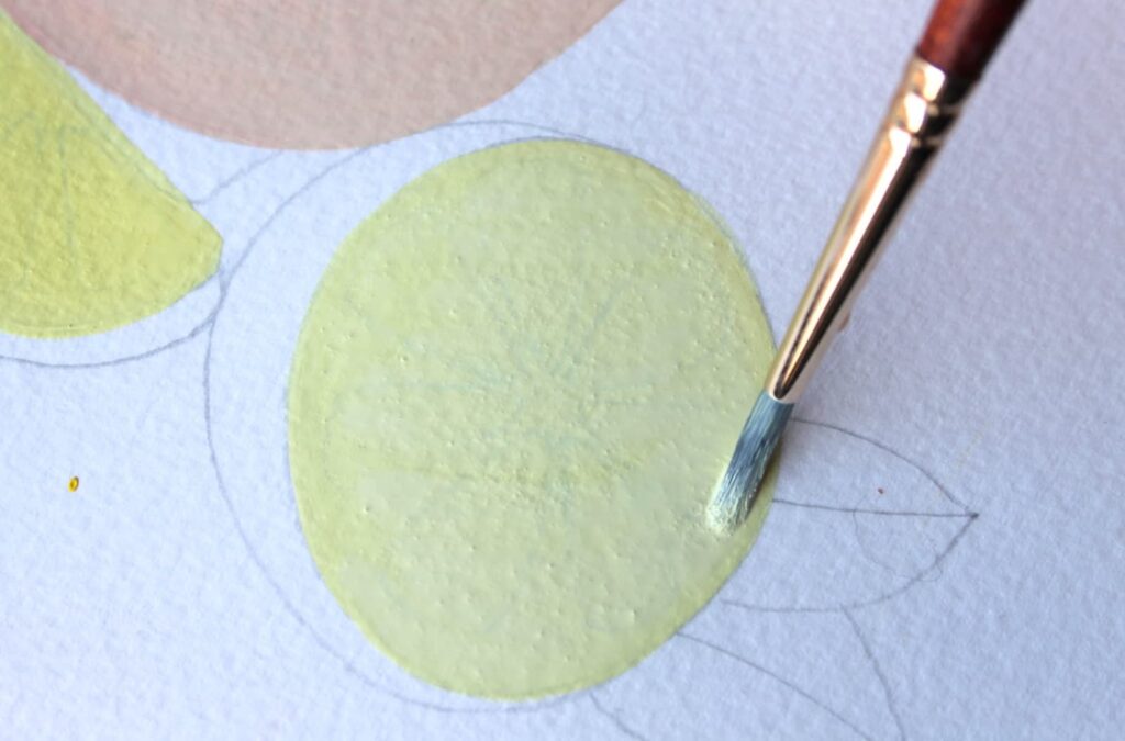 Passiamo adesso a dipingere la base dei limoni con un tono di giallo chiaro che otterrete mescolando il Bianco Titanio con una punta di Giallo Primario.