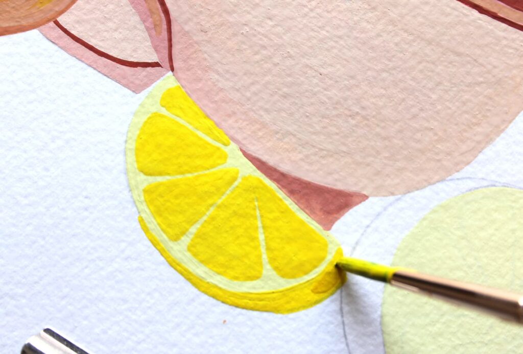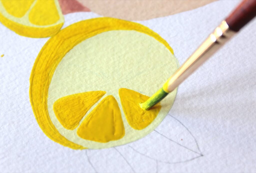 Una volta asciugata la base con il Giallo Primario dipingiamo i triangoli degli spicchi e le bucce. Grazie alla punta del pennello potrete procedere per definire agevolmente anche i dettagli.
