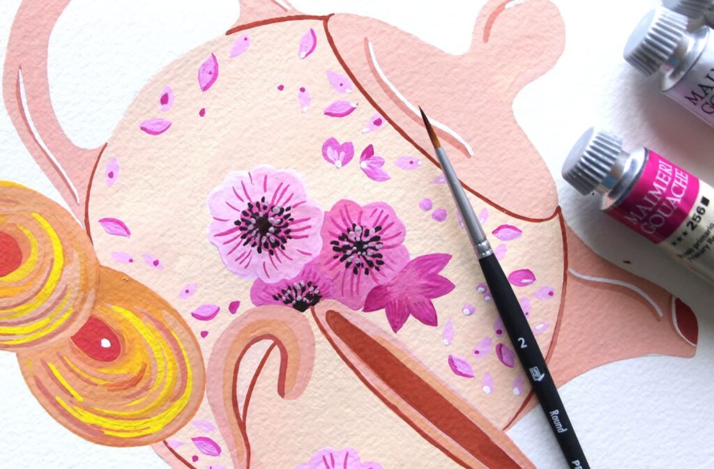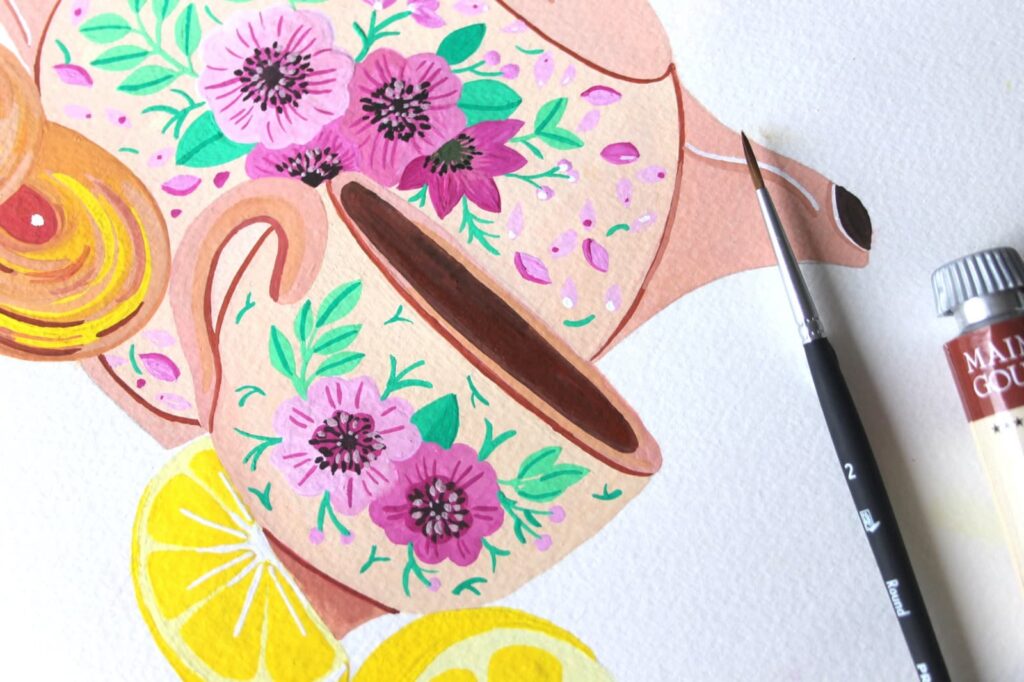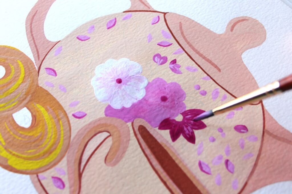 Passiamo adesso alla decorazione della teiera. Per dipingere i fiori che abbiamo disegnato ho selezionato il Bianco di Titanio e il Rosso Magenta che ho mescolato per ottenere diverse gradazioni di rosa con cui dipingere i fiorellini sulla tazza e la teiera. In questa fase dipingeremo direttamente sulla base di colore asciutto.