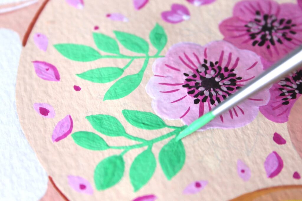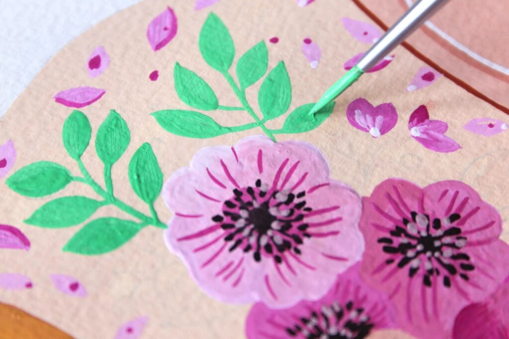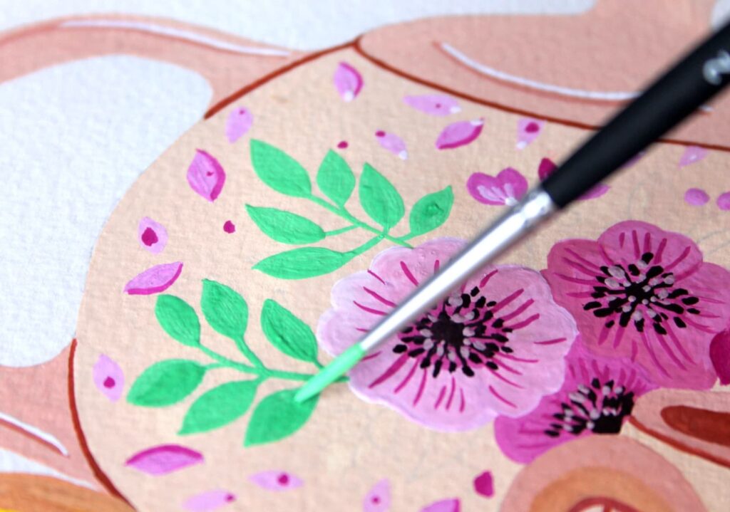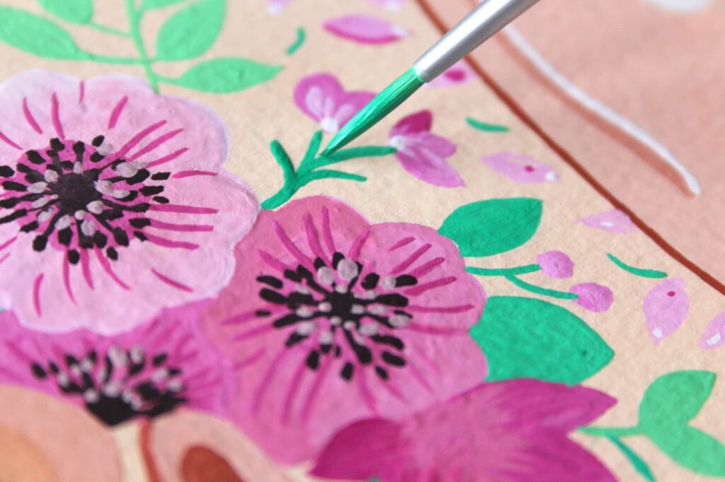 Con il pennello n° 2 Aqua Elite Princeton dipingete i pistilli dei fiori e con il Rosso Magenta definite i petali. Grazie alla punta sottile e flessibile di questo pennello riuscirete a dipingere anche i dettagli più minuziosi delle foglie.