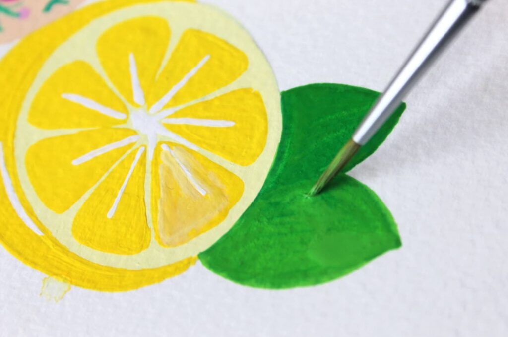Adesso passiamo al verde delle foglie. Su una tavolozza mescolate il Verde Smeraldo con un goccio d’acqua che useremo unito ad una punta di Giallo Primario per le foglie dei limoni.