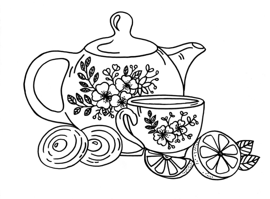 Per la mia composizione ho scelto un grazioso set da the con teiera e tazza in porcellana con decorazione floreale, biscotti e limone.