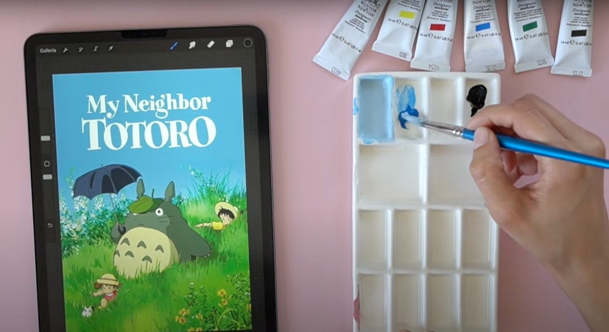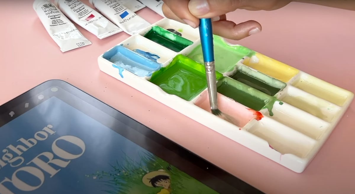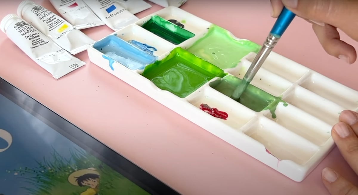 I colori del dipinto saranno molto accesi, stile tipico dello Studio Ghibli. Per realizzare la palette di colori è necessaria una tavolozza che abbia dei pozzetti ben separati tra loro, in modo da favorire la miscelazione.