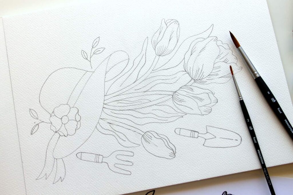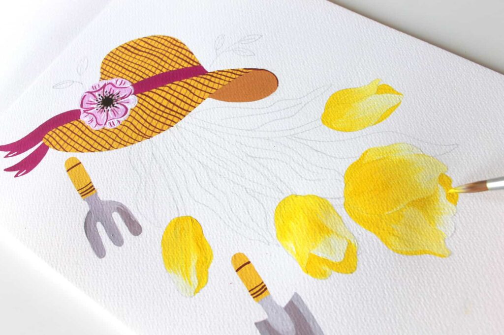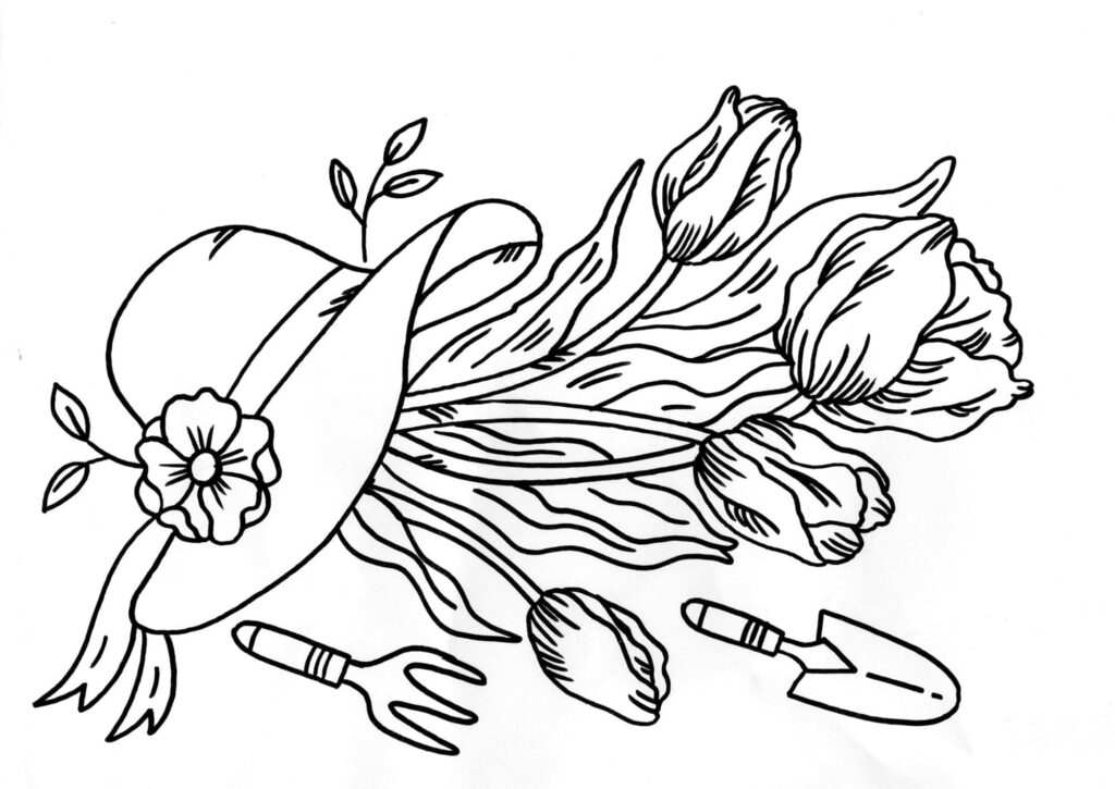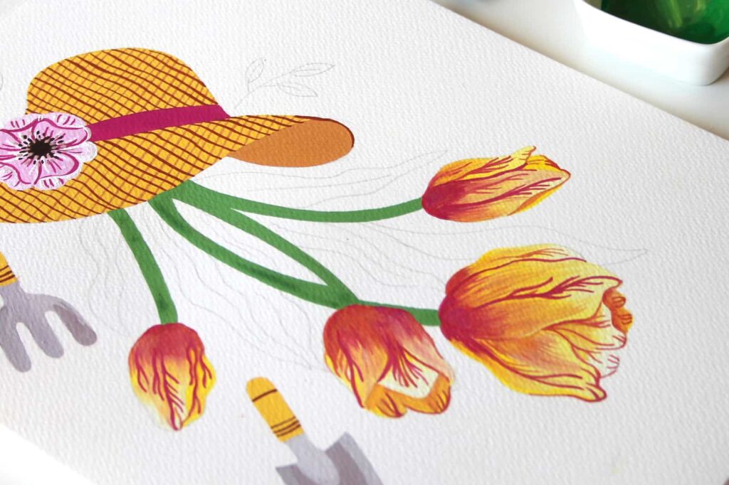 Per la mia composizione ho pensato a dei tulipani appena raccolti, il cappello di paglia, immancabile per chi vuole trascorrere del tempo all’aperto o in giardino, e alcuni attrezzi da giardinaggio.