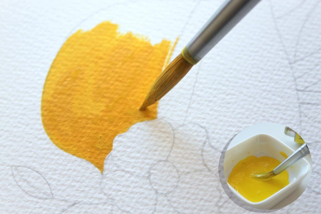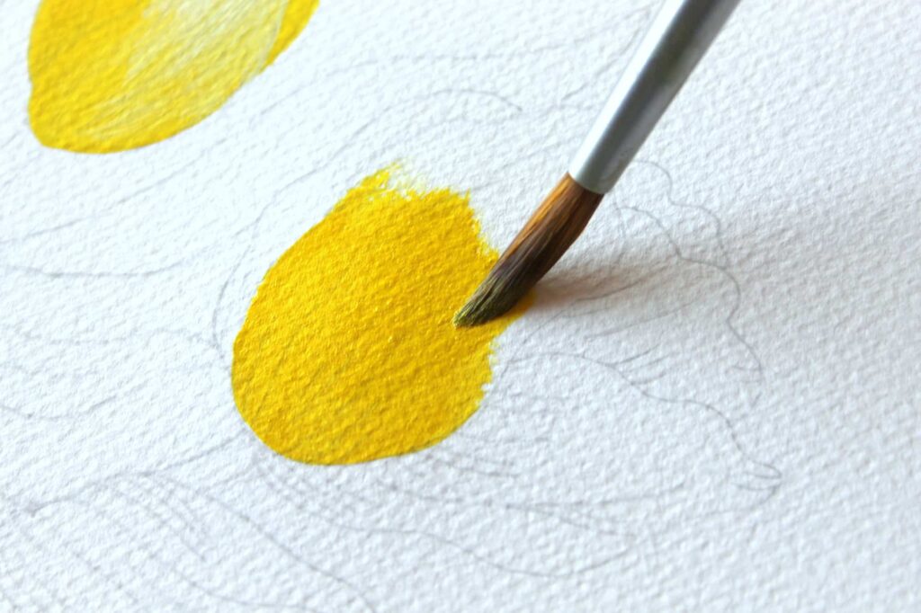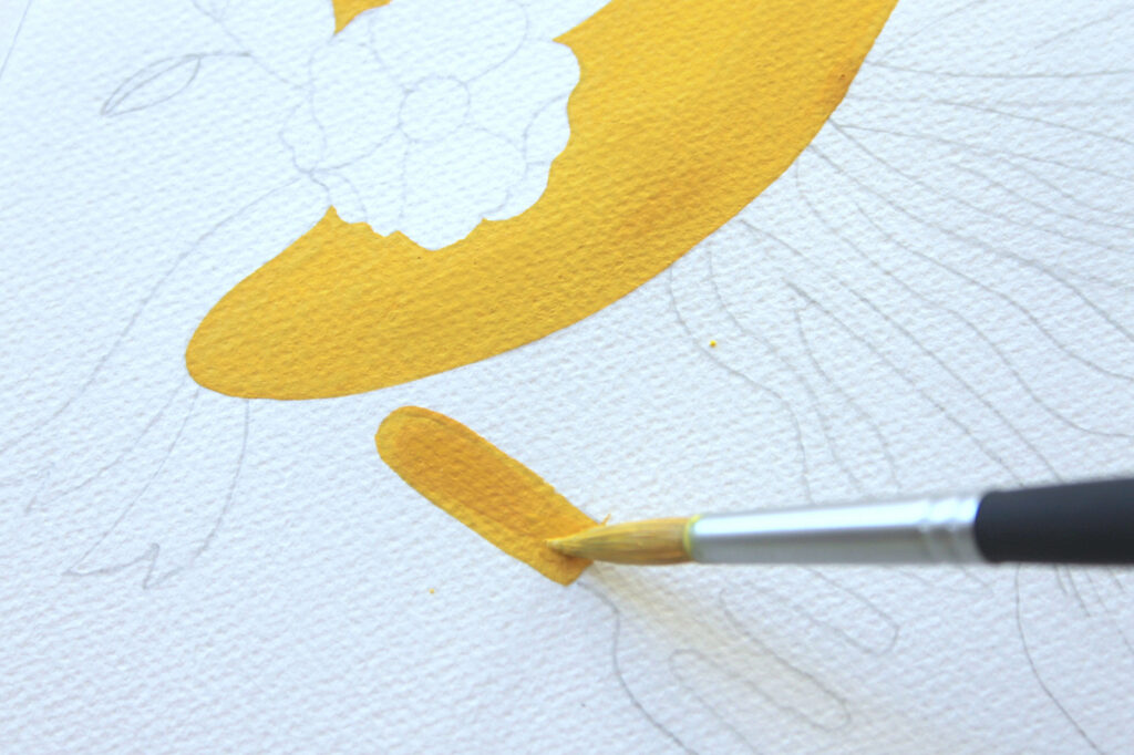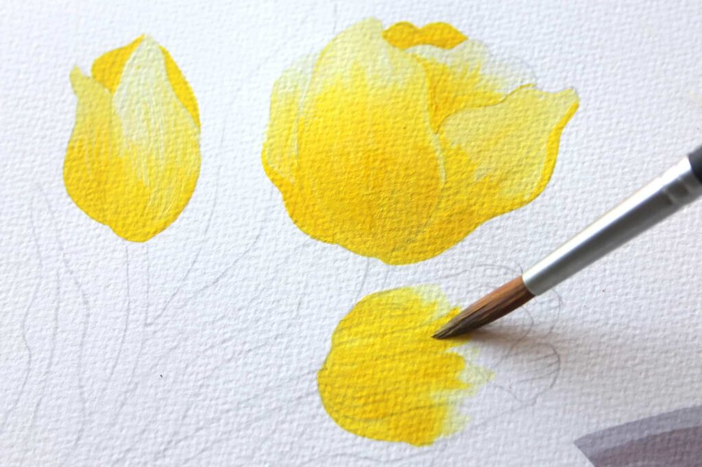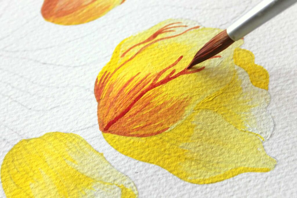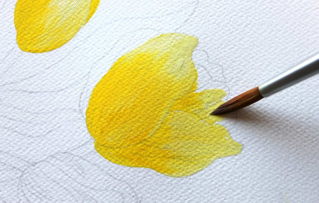 Passiamo adesso a dipingere la base dei tulipani con un tono di giallo chiaro che otterrete mescolando il Giallo Primario con una punta di Bianco Titanio. Con il Pennello n° 8 tondo Aqua Elite by Princenton dipingete la base dei bulbi con il colore più carico, sfumate poi il colore man mano che raggiungete la punta dei petali.