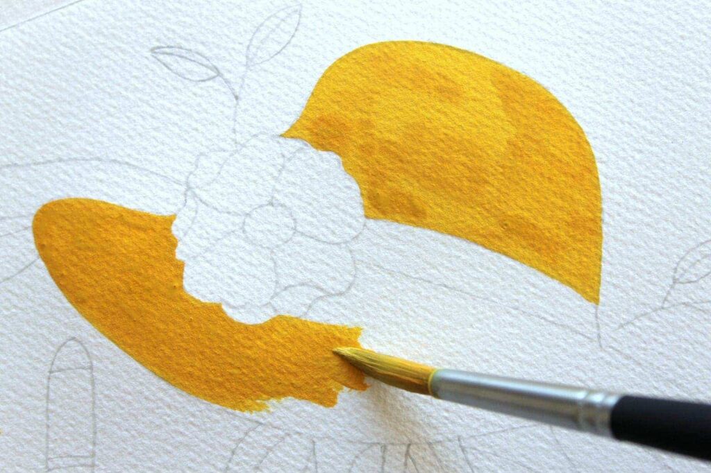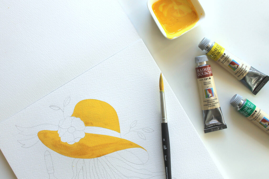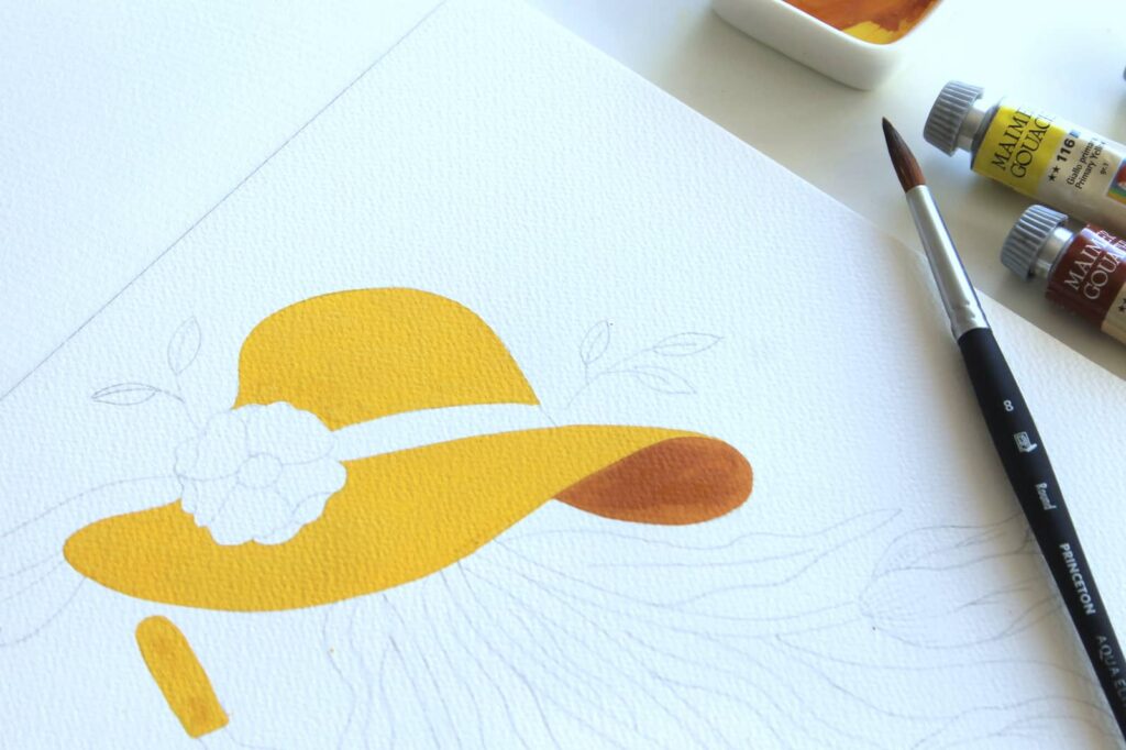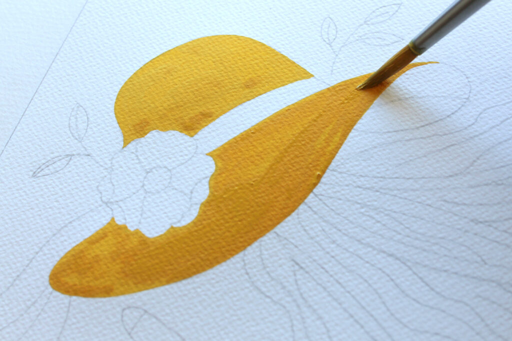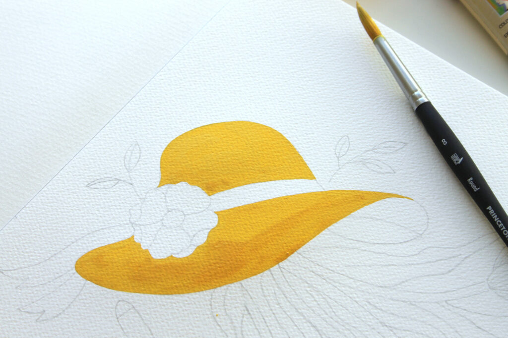Con il Pennello n°8 tondo Aqua Elite by Princenton dipingete la base del cappello. Lasciate bianchi il fiore e il nastro, su cui ritorneremo in seguito. Stendete il colore sul foglio in maniera uniforme seguendo lo stesso verso in modo che all’asciugatura risulti omogeneo, già alla prima pennellata il colore risulta molto corposo e coprente. Evitate di ripassare con il pennello sul colore ancora in fase di asciugatura.