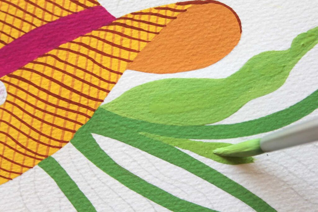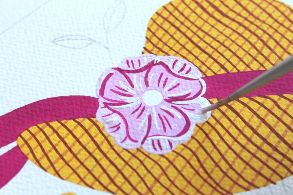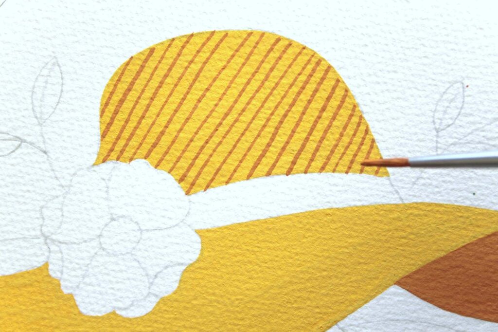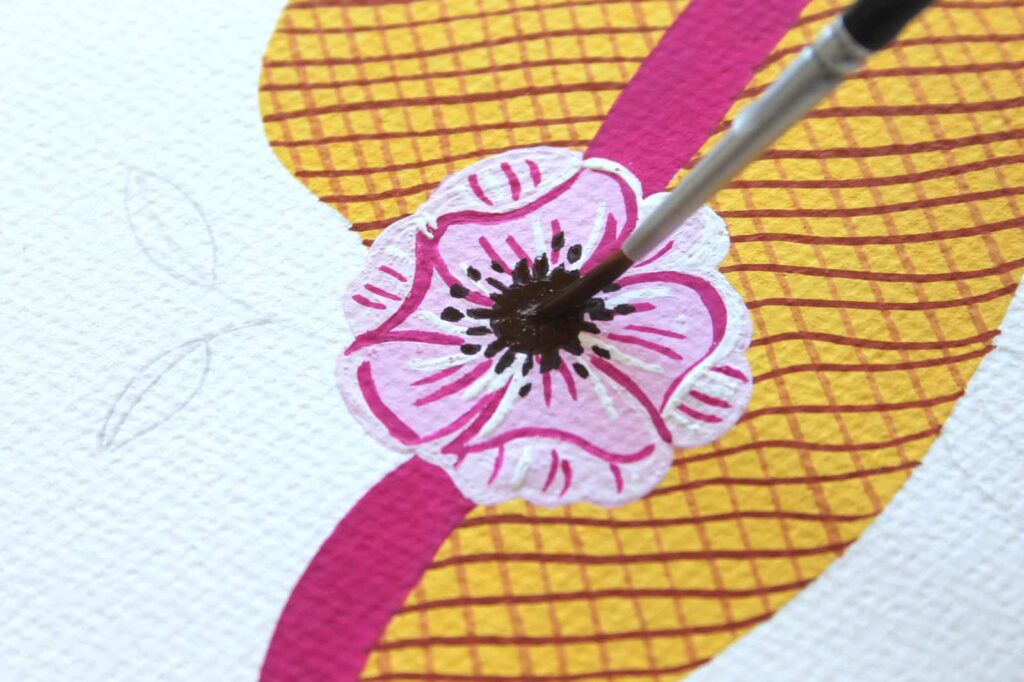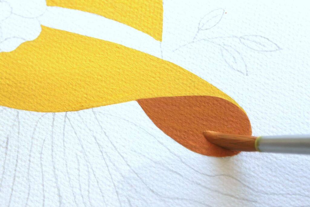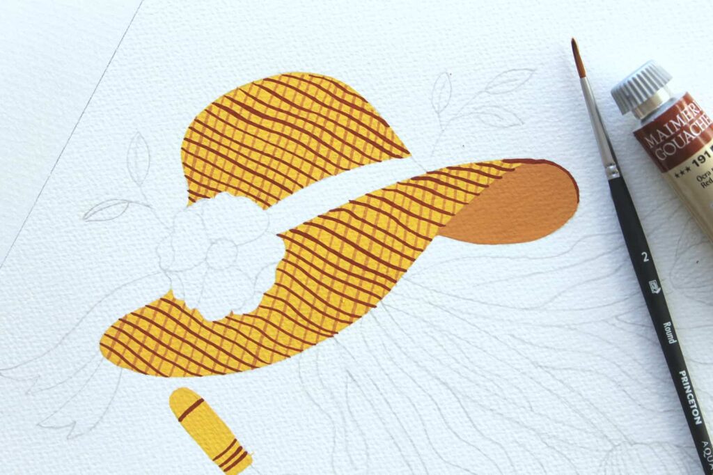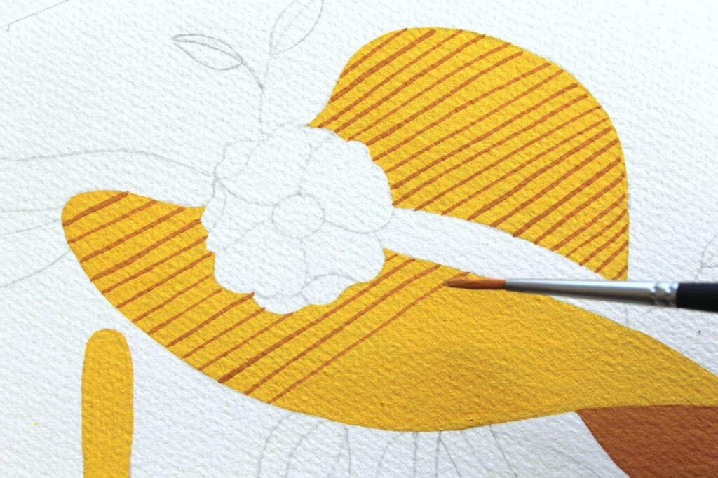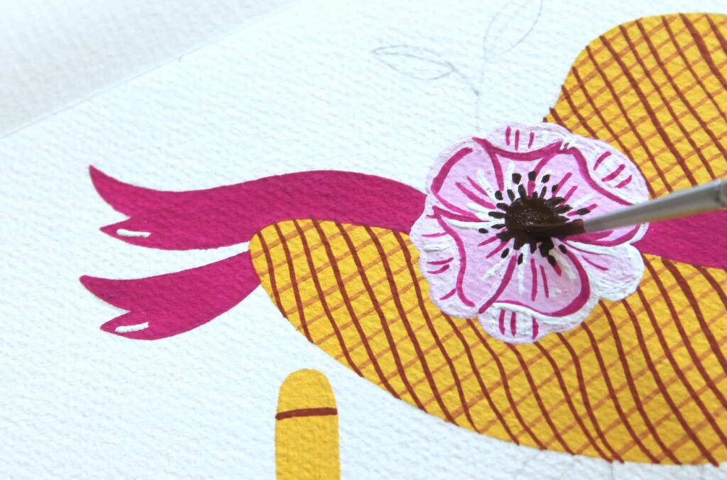 Con il Pennello n° 2 tondo Aqua Elite by Princenton dipingete, con il Rosso Magenta Primario, il nastro del cappello e definite i petali del fiore, con il Magenta e il Bianco Titanio. Per la corolla mescolate l’Ocra Rossa con una punta di Nero, picchiettate intorno la corolla con la punta del pennello formando dei trattini sottili come dei piccoli raggi.