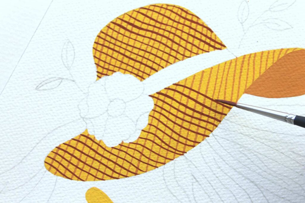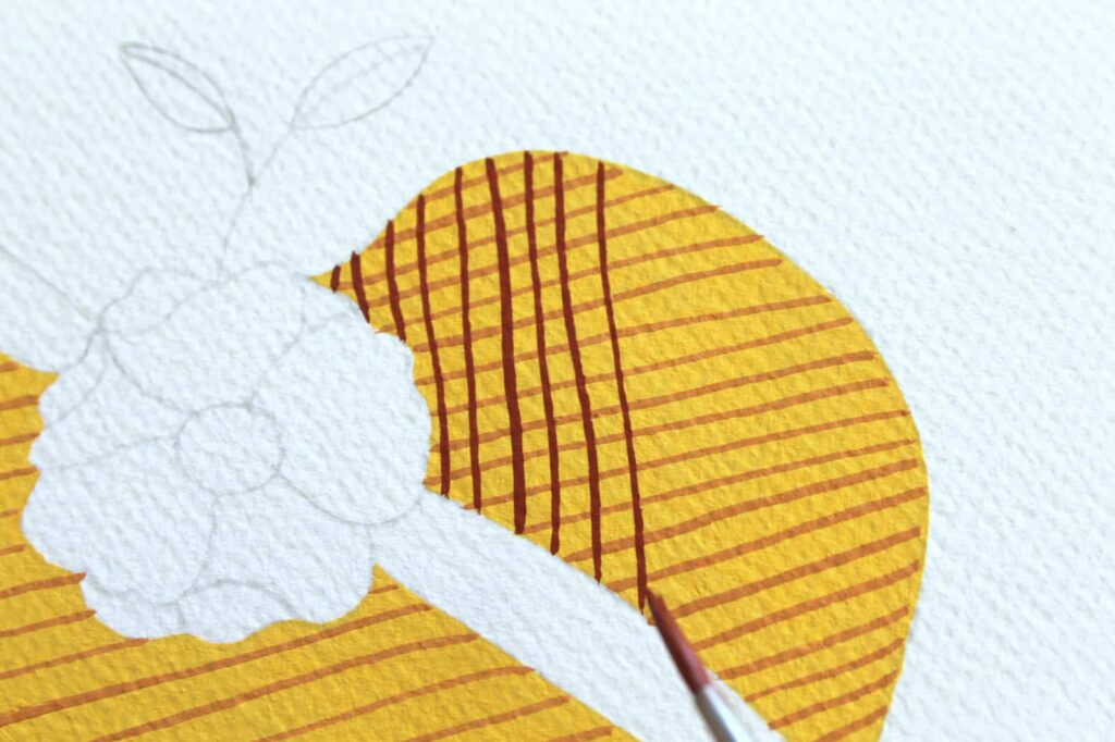 Una volta terminate le linee lasciate asciugare. Preparate sulla tavolozza l’Ocra Rossa diluita con un goccio d’acqua, con la quale andrete a dipingere le linee nel verso opposto per creare l’intreccio. Tirate delle linee leggermente ondulate, in questo modo otterrete un effetto più naturale.