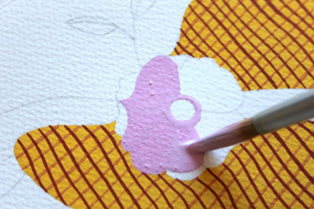 Diluite il Rosso Magenta Primario e una punta di Bianco Titanio, all’occorrenza aggiungete una goccia d’acqua e mescolate i colori ottenendo un bel lilla pastello per il fiore. Dipingete i petali prestando attenzione a non fuoriuscire dai bordi.