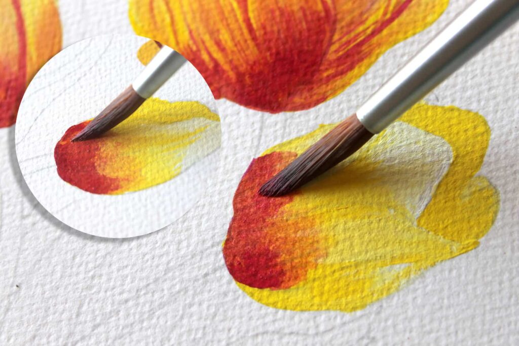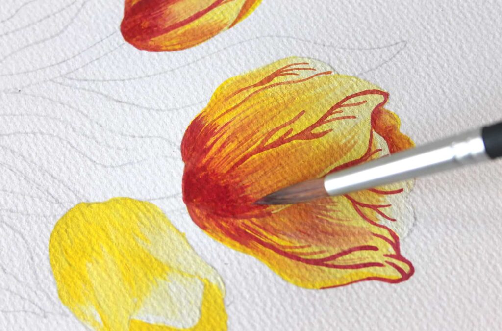 Passiamo adesso a definire i petali con una miscela di Rosso Magenta e Giallo con cui otterremo un rosso aranciato e caldo per dipingere le venature. In questo modo doteremo i petali di differenti gradazioni di colore.