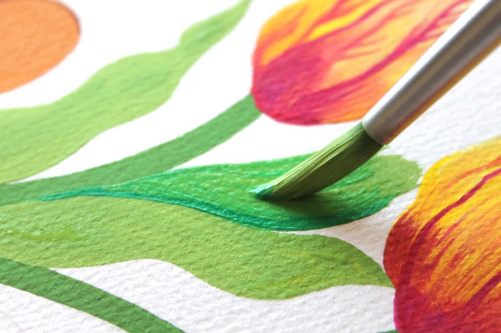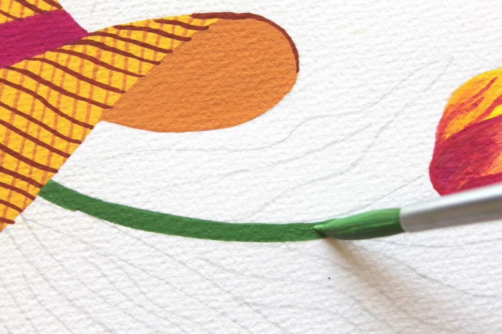 Su una tavolozza mescolate il Verde Smeraldo con una punta di Bianco Titanio e di Giallo Primario, il tutto aggiungendo un goccio d’acqua, ottenendo un verde dal tono caldo, per gli steli.