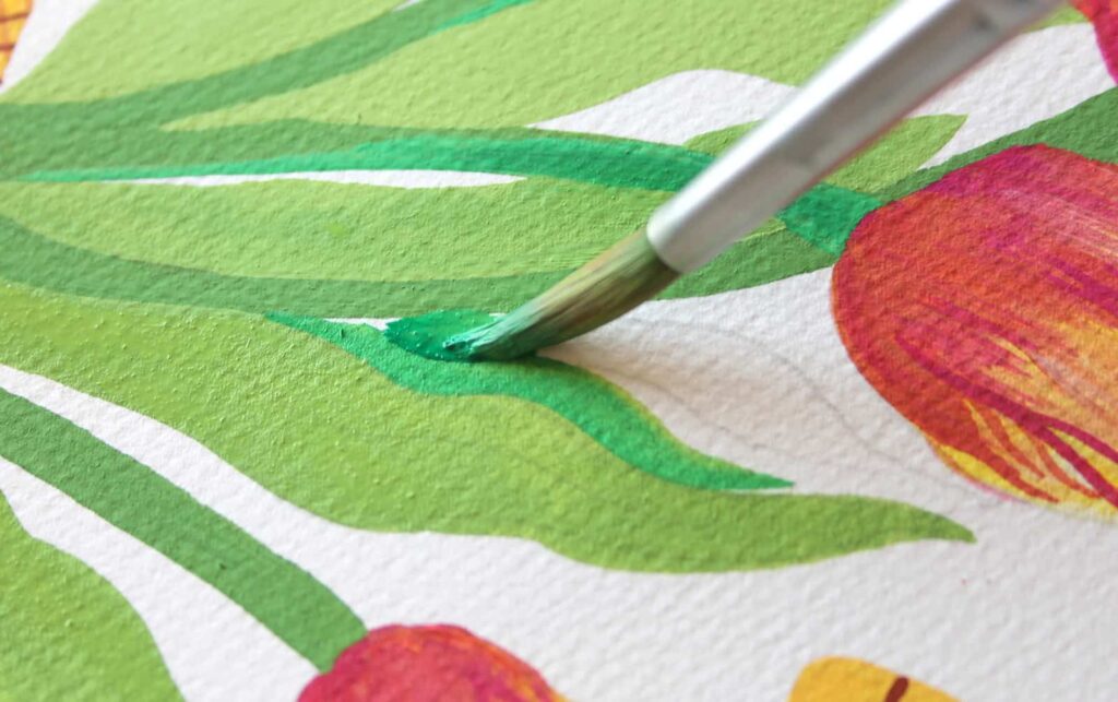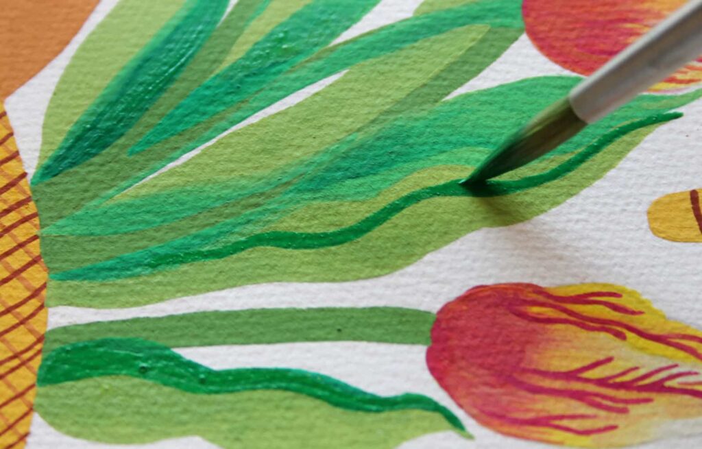 Sempre con la punta del pennello, dipingete le venature delle foglie con il Verde Smeraldo, tracciando delle linee ondulate nel verso della lunghezza di ciascuna foglia.