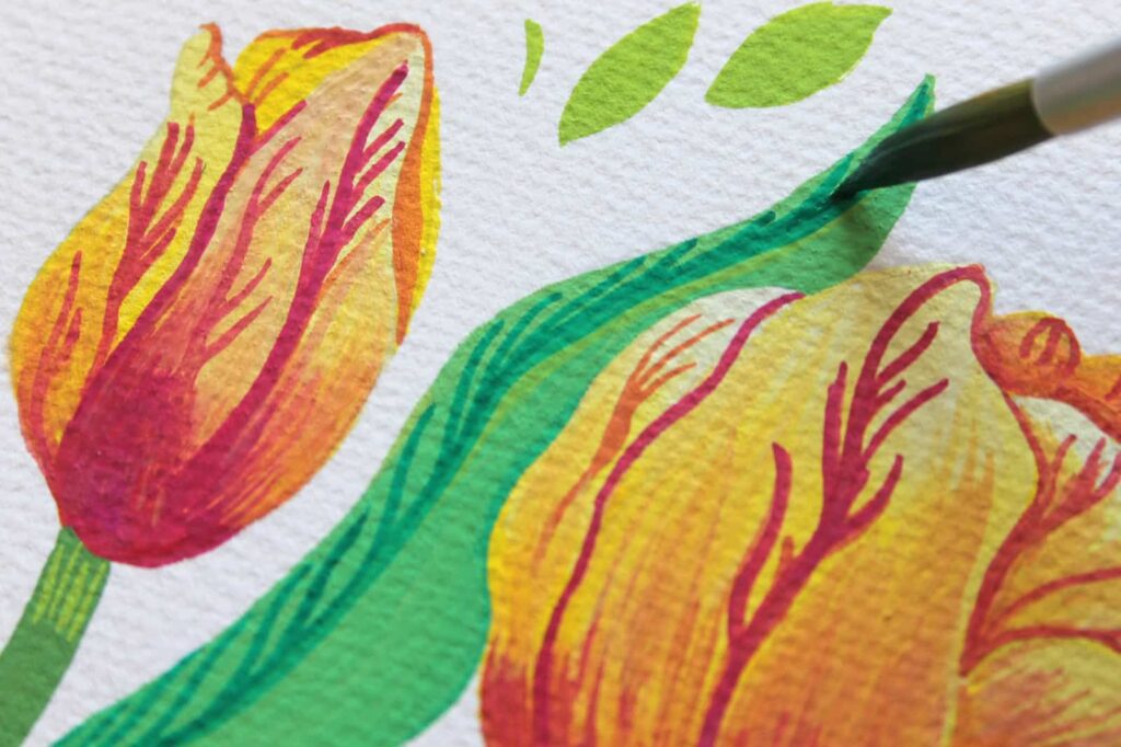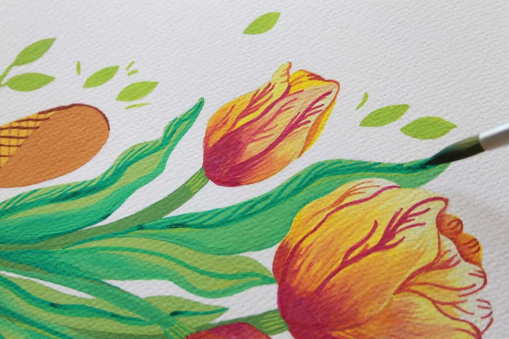 Ecco che i nostri tulipani iniziano a prendere vita nel loro giallo brillante e corposo. Dipingete tutti i bulbi sfumando il colore realizzando così la base su cui, una volta asciugato il colore, andremo a definire le venature dei petali con il Rosso Magenta Primario. Grazie alla punta del pennello potrete procedere per definire agevolmente anche i dettagli.