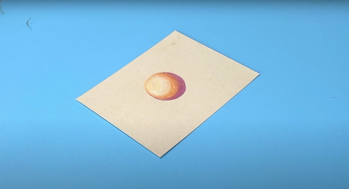 Per mostrarti come stendere e poi sfumare il colore, abbiamo disegnato una sfera una sfera. Grazie al blender è possibile uniformare la stesura in maniera molto semplice. Il nostro consiglio è quello di fare dei tratti sul foglio prima di passare da un colore all’altro, per togliere dalla mina il colore che hai sfumato.
