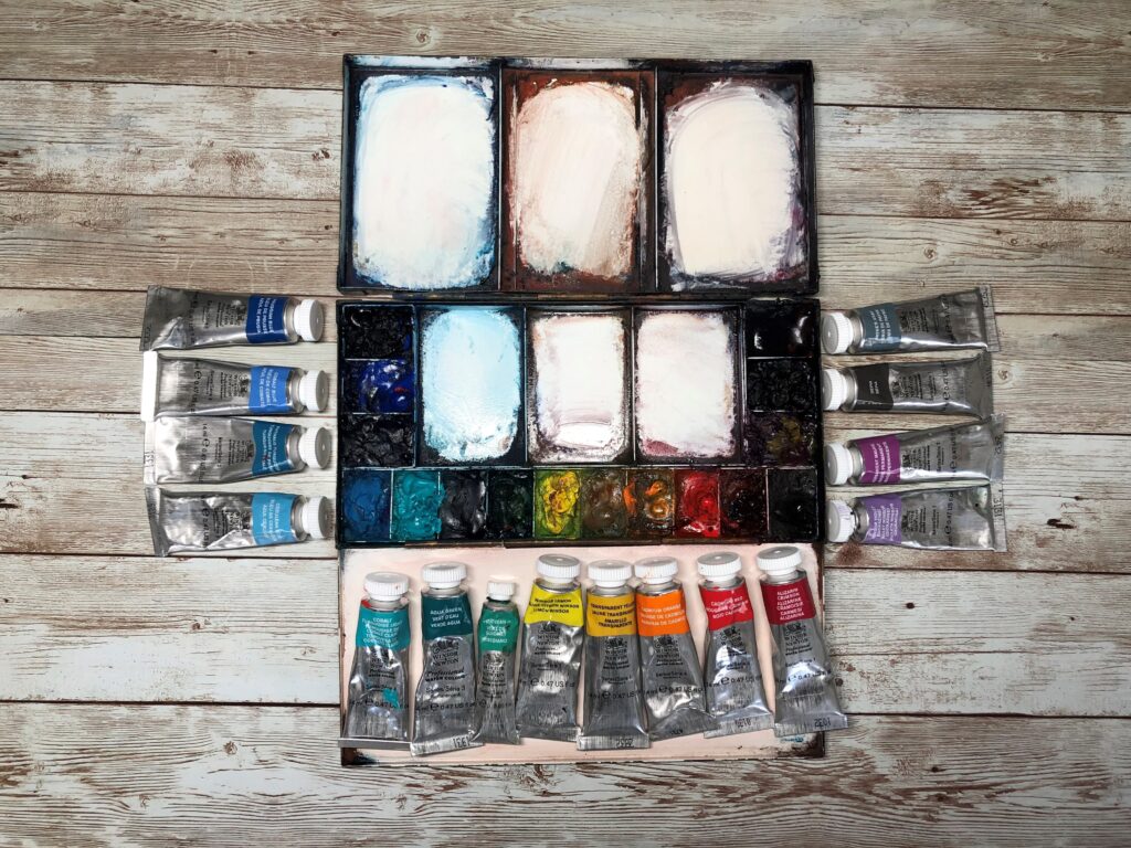 Blu di Prussia (538), Blu di Cobalto (178), Turchese Ftalo (526), Blu Ceruleo (137), Turchese di cobalto chiaro (191), Verde Acqua (697), Verde Veronese (692), Giallo Winsor (730), Giallo Trasparente (653), Giallo di cadmio arancio (089), Rosso di cadmio (094), Cremisi d’alzarina (004), Viola Winsor (733), Malva permanente (491), Seppia (609), Grigio di Payne (465)