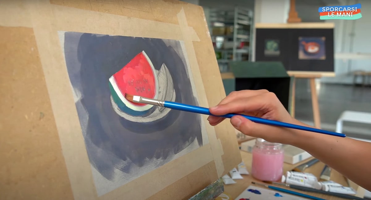 Per la seconda fetta di anguria, Giannalisa utilizza più o meno lo stesso procedimento utilizzato per la prima. Questa volta però parte direttamente dal colore rosso della polpa. In questo modo può lavorare per accostamento con i colori dipinti in precedenza. Fatto ciò passa alla buccia.