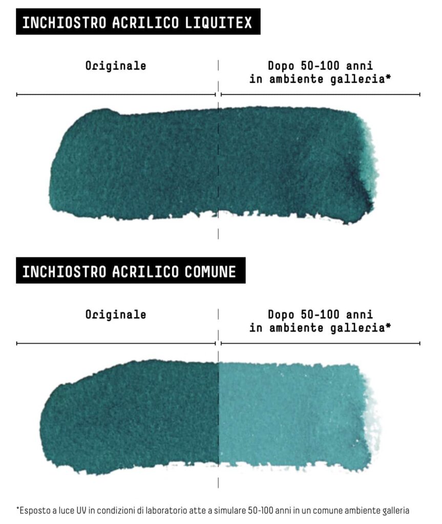Gli acrilici liquidi Liquitex Ink invece sono prodotti a partire da pigmenti puri e di assoluto pregio. Gli stessi pigmenti utilizzati anche per altre serie di colori acrilici come Heavy Body o Soft Body.