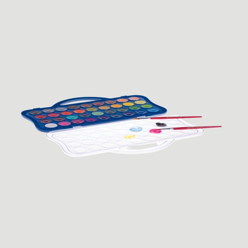 Confezione Acquerelli Giotto, 36 colori e pennello. I colori sono luminosi e coprenti, diluibili con acqua per effetti trasparenti. La confezione include un coperchio che funge da tavolozza e un design pratico che evita la dispersione dell'acqua, rendendola perfetta per tutte le attività artistiche. Al suo interno è presente anche un pennello.