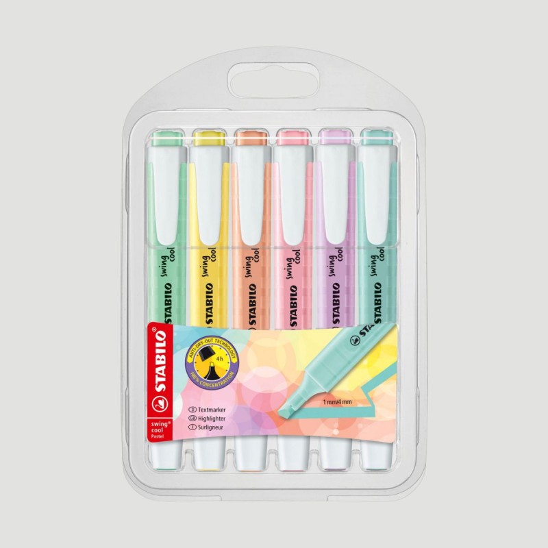 Confezione 6 Evidenziatori Swing Cool STABILO, colori pastello. Confezione da 6 evidenziatori STABILO Swing Cool nei toni pastello: carta da zucchero, rosa antico, glicine, verde menta, giallo banana e rosa pesca. Con tecnologia Anti-Dry-Out, resistono fino a 4 ore senza tappo.