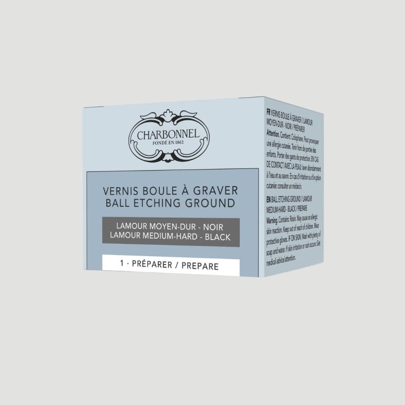 La Vernice in Cono Lamour Dura di Charbonnel fornisce una finitura nera opaca che rende il lavoro ad incisione estremamente chiaro. Il suo utilizzo è consigliato per incidere dettagli fini e linee profonde. Rispetto alla Vernice in Cono Dura è leggermente più morbida. Consigliamo di applicare su lastra calda servendosi di un tampone in cuoio o di un rullo per incisione.