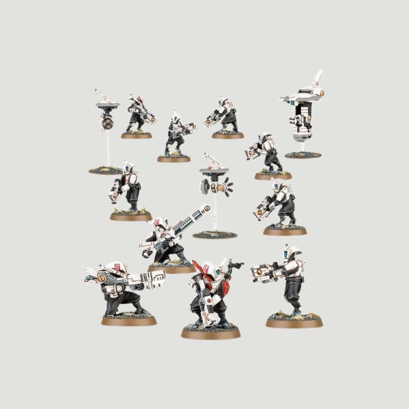 Questo set permette di assemblare 10 T'au Pathfinders insieme a tre droni di supporto, dotati di equipaggiamenti che migliorano le capacità tattiche del gruppo.