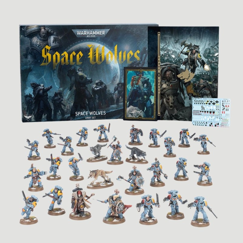 Space Wolves Army Set, Confezione Warhammer 40000. Lo Space Wolves Army Set è una confezione esclusiva con 28 miniature inedite, Codex Supplement da 104 pagine in edizione deluxe, 25 datasheet card e foglio trasferibili con 419 decalcomanie. Disponibile fino a esaurimento scorte.