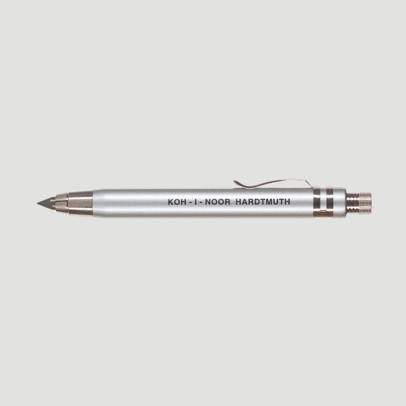 Portamine in metallo satinato Koh-I-Noor. Un elegante strumento da disegno con un fusto rotondo e una mina da 5,6 mm. Dotato di sistema di avanzamento a caduta e affilamine incorporato, è perfetto per artiste e artisti professionisti.