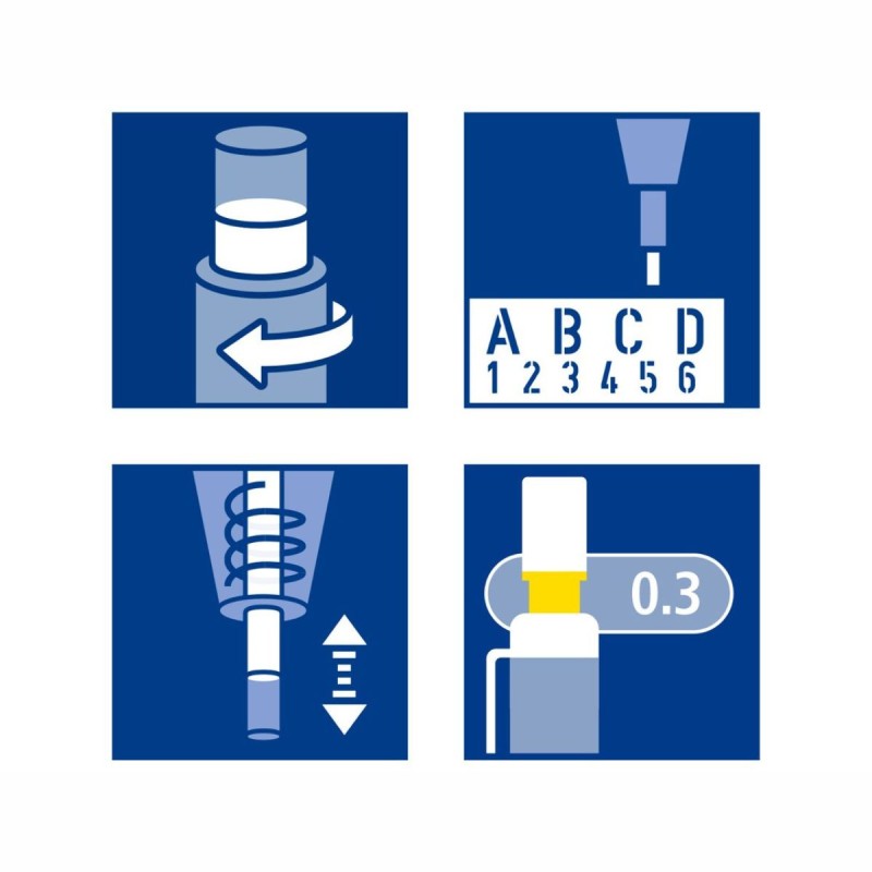 Si può ricaricare con ben 12 mine da 0.3mm e noi consigliamo Micro Carbon per restare nella stessa serie e garantire massima efficenza.