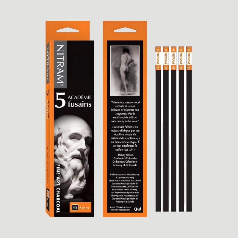 Confezione 5 Carboncini Tradizionali Nitram, Gradazione HB. Con la loro gradazione medio-morbida sono ideali per chi cerca toni profondi e dettagli definiti. Perfetti per lavori dettagliati e schizzi rapidi, lasciano pochi residui di polvere e sono meno fragili dei tradizionali carboncini.