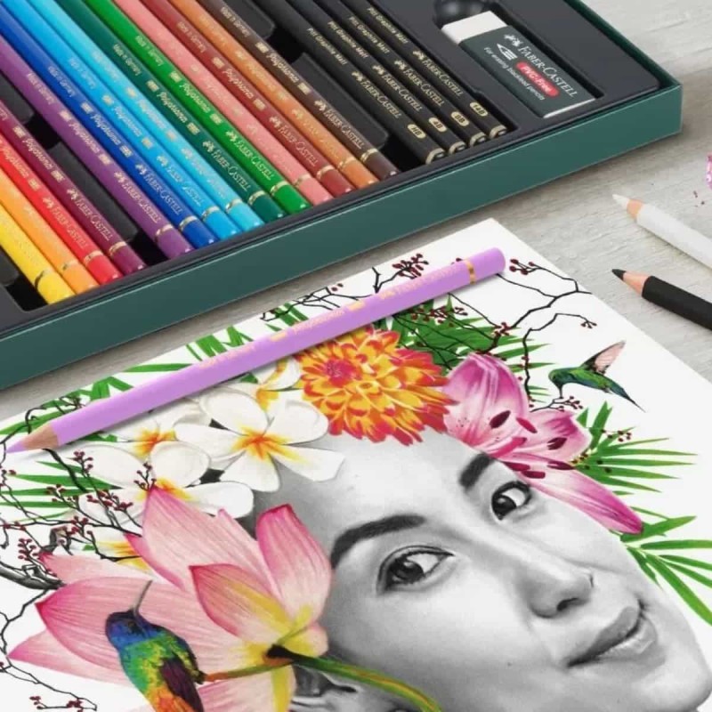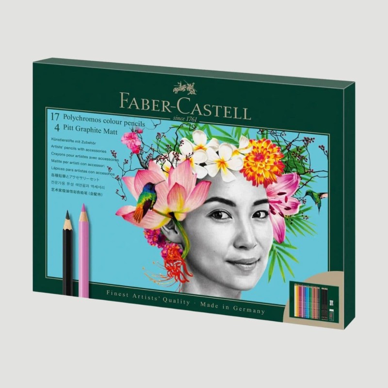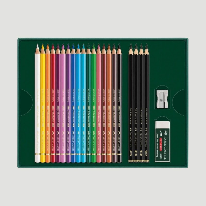 Il set include 17 matite colorate Polychromos e 4 matite Pitt Graphite Matt, perfettamente bilanciate per soddisfare le esigenze di chi lavora con il colore e la grafite. In aggiunta a questi due prodotti potrai trovare anche una gomma e un temperino.