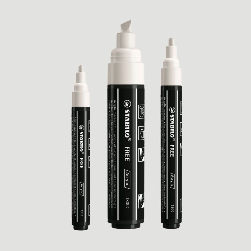 Con i Marker Acrilici STABILO FREE Acrylic puoi finalmente superare ogni limite creativo: personalizza oggetti, sperimenta tecniche miste e dai forma al tuo stile con uno strumento versatile, facile da usare e pronto a tutto. Questa confezione contiene 3 marker bianchi (colore 700) con tre punte diverse, per adattarsi a ogni esigenza espressiva: tratto fine, medio o largo, in base al modello selezionato.