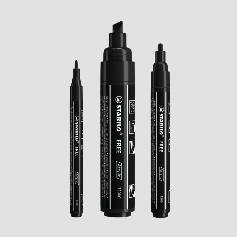 Con i Marker Acrilici STABILO FREE Acrylic puoi finalmente superare ogni limite creativo: personalizza oggetti, sperimenta tecniche miste e dai forma al tuo stile con uno strumento versatile, facile da usare e pronto a tutto. Questa confezione contiene 3 marker neri (colore 700) con tre punte diverse, per adattarsi a ogni esigenza espressiva: tratto fine, medio o largo, in base al modello selezionato.