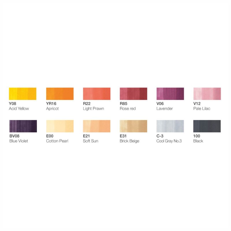 Il set comprende i seguenti colori: E00 (Cotton Pearl), E21 (Soft Sun), YR16 (Apricot), V06 (Lavender), Y08 (Acid Yellow), BV08 (Blue Violet), R22 (Light Prawn), R85 (Rose Red), C3 (Cool Gray No. 3), V12 (Pale Lilac), E31 (Brick Beige), 100 (Black).