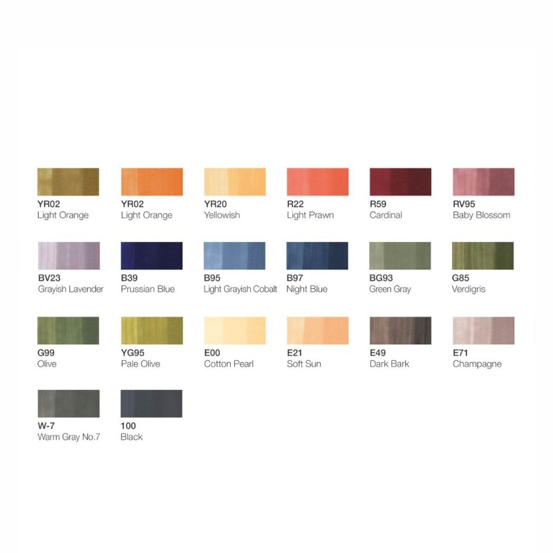 Il set comprende i seguenti colori: E00 (Cotton Pearl), E21 (Soft Sun), E49 (Dark Bark), E71 (Champagne), R22 (Light Prawn), YG95 (Pale Olive), G85 (Verdigris), Y28 (Lionet Gold), BV23 (Grayish Lavender), B97 (Night Blue), B39 (Prussian Blue), G99 (Olive), BG93 (Green Gray), B95 (Light Grayish Cobalt), RV95 (Baby Blossoms), YR20 (Yellowish Shade), YR02 (Light Orange), R59 (Cardinal), W7 (Warm Gray No. 7), 100 (Black).