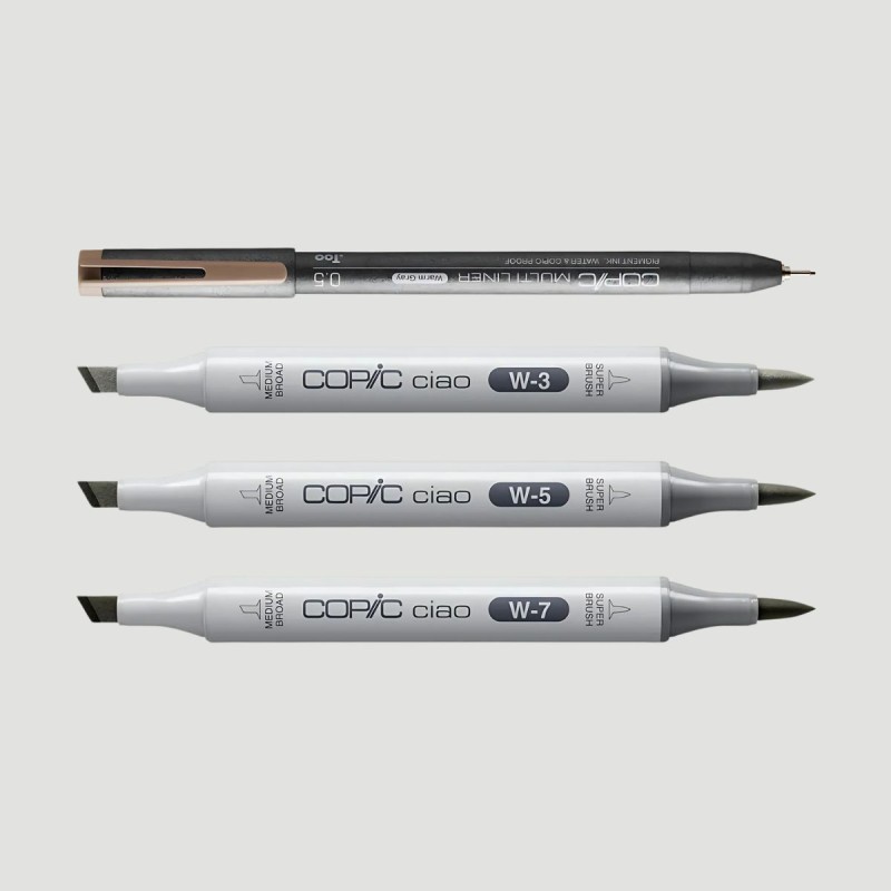 Set 3 Marker Copic Ciao Dark Warm Grey, toni di grigio caldo scuro con 1 Copic Multiliner. Un kit perfetto per chi desidera esplorare le sfumature calde del grigio. Include tre marker nelle tonalità Warm Gray No. 3, 5 e 7, oltre a un Copic Multiliner Warm Gray da 0,5 mm per definire contorni e dettagli.