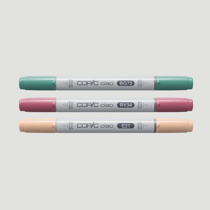 I marker Copic Ciao sono dotati di doppia punta, una a pennello, ideale per sfumature morbide e ampie, e una a scalpello, ottima per aggiungere dettagli o texture. Vengono realizzati con inchiostri a base di alcol, sono ricaricabili e le punte possono essere sostituite, assicurando una lunga durata del prodotto.