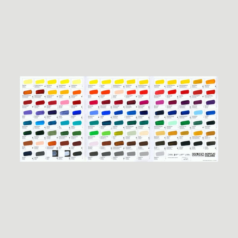 Cartella colori dipinta a mano Golden con campioni reali delle linee Heavy Body, Fluid e Open, ideale per valutare resa cromatica e finitura prima dell’acquisto.