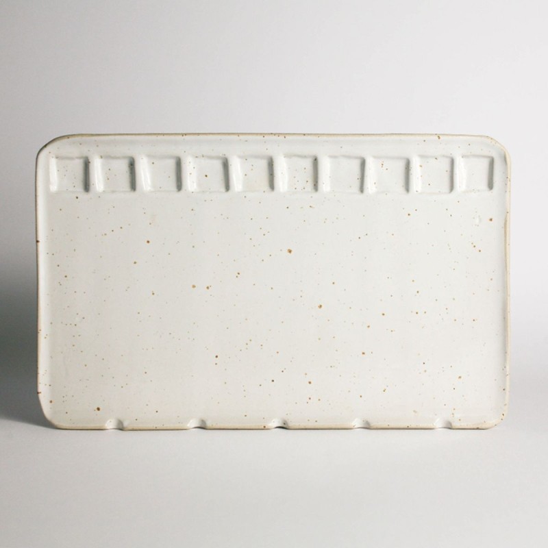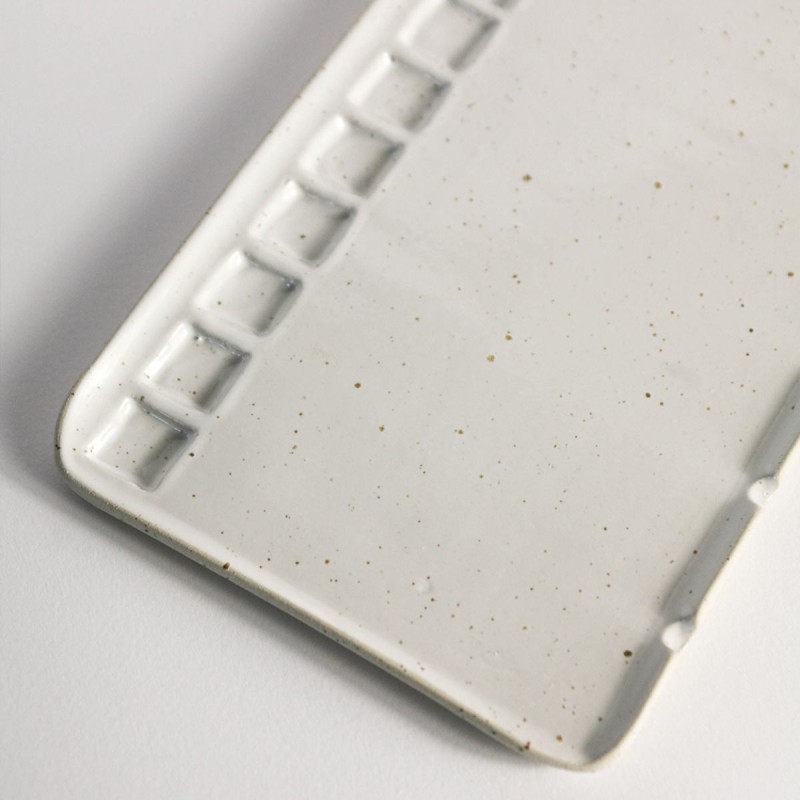 Tavolozza In Ceramica Large Vanilla Fatta a Mano Myuras. Tavolozza artigianale in grès beige puntinato, ampia e resistente. Dotata di scomparti per i colori, un’ampia area di miscelazione e 5 fessure per i pennelli. Perfetta per la pittura ad acquerello.