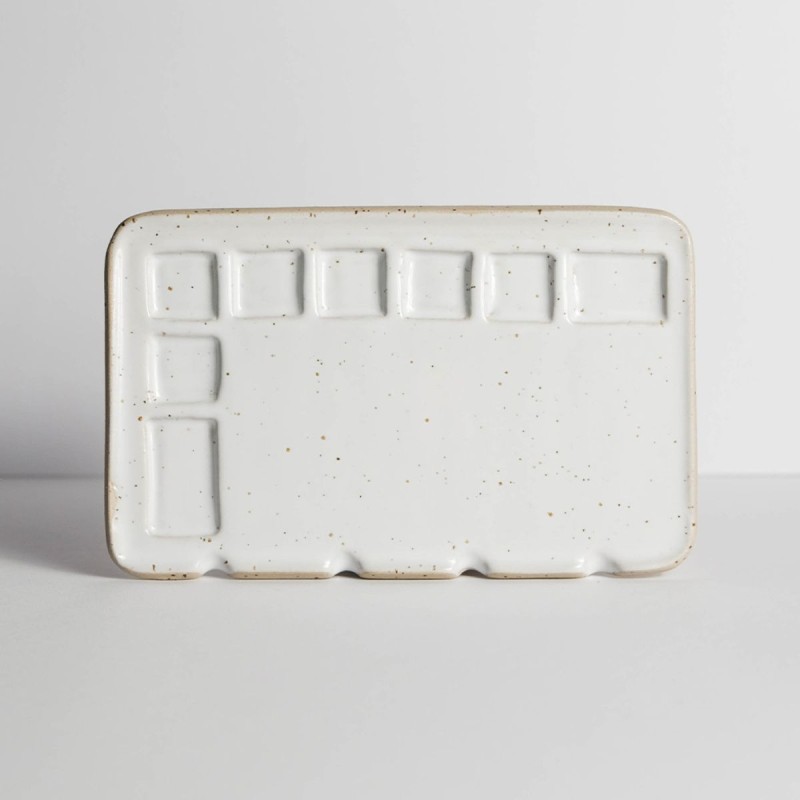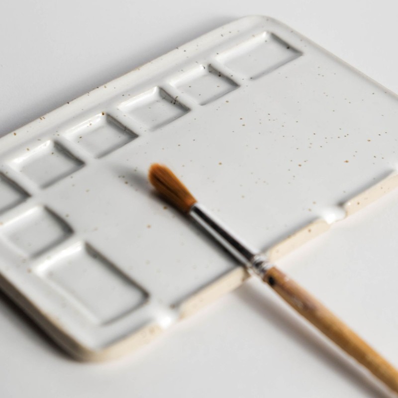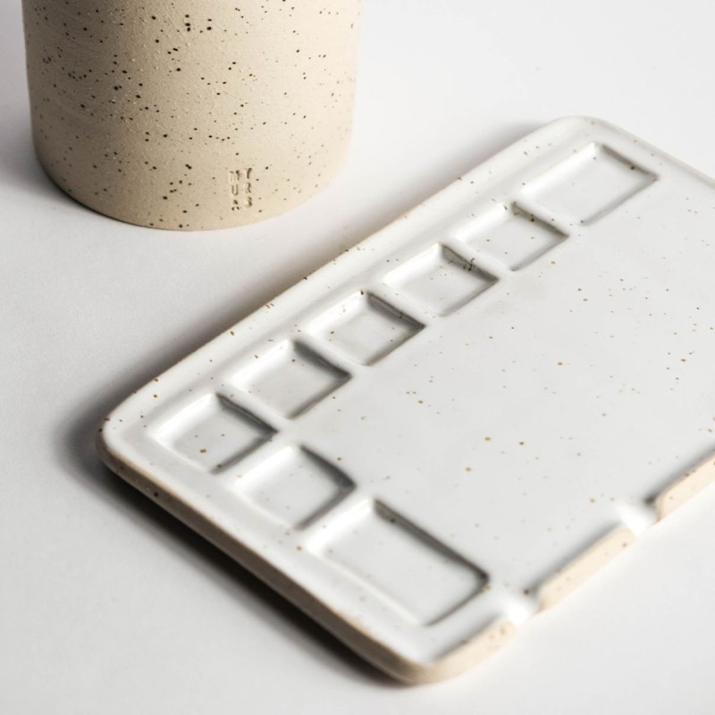 Tavolozza di medie dimensioni realizzata a mano in gres beige puntinato, realizzata da una piccola realtà artigianale che rende ogni pezzo unico e speciale. Pensata sopratutto per la pittura ad acquerello, offre 8 scomparti per contenere e mescolare i colori, mentre le 4 fessure permettono di posizionare i pennelli in modo pratico e ordinato.