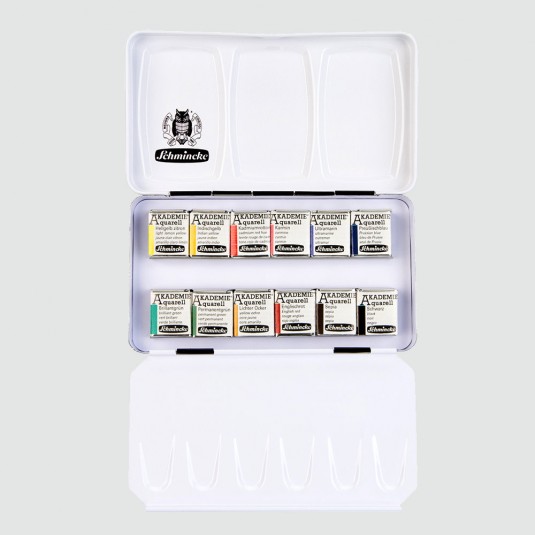 Stupenda confezione acquerelli Akademie Schmincke in edizione speciale con coperchio stampato! All'interno troverai 12 mezzi godet e coperchio con tavolozza integrata.