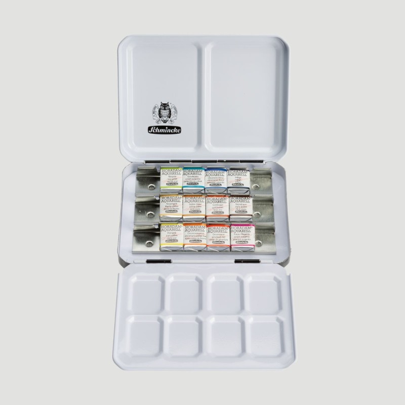 EDIZIONE LIMITATA Felix Scheinberger Set Acquerelli Horadam Schmincke, 12 Mezzi Godet. Una selezione di 12 colori prestigiosa, in formato mezzo godet, effettuata in collaborazione con l'artista Felix Scheinberger, ideale per urban sketching e illustrazione creativa.
